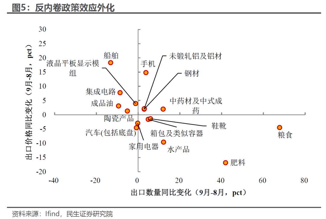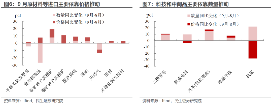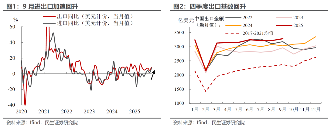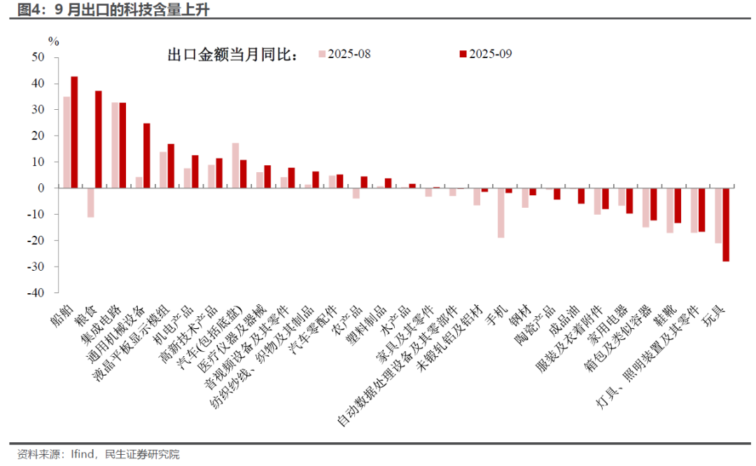 9月进出口数据加速回升,其持续性如何?超预期的背后是趋势还是短期扰动?我们认为,9月出口的超预期表现主要体现在以下三个方面: 首先,出口金额环比再次上行,表明当前出口回升并非仅受低基数效应推动,更折射出我国市场多元化布局与产业链升级的扎实成效。 其次,贸易冲突背景下出口格局的创新,不仅“新”在产品结构升级,更“新”在出口市场拓展。高新技术产品出口大幅回升的同时,我国对非洲、拉美等新兴市场的出口也实现显著增长。 最后,在“反内卷”趋势下,价格修复开始向外部传导。9月多数出口产品价格逐步修复,“量稳价升”的良好态势愈发明显。 值得注意的是,9月进口增速也大幅回升并创下年内新高。不过这一增长更多受大宗商品价格上涨驱动,内需相关产品的修复力度仍显薄弱。 具体来看: 对于出口端,新旧动能转换下,出口的“新质”含量继续为其保驾护航: 以欧盟和非洲、拉美等新兴经济体为代表的新增长动能再度发力。尤其是“一带一路”提出以来,中国企业在非洲等地区大规模投资基础设施,并凭借价格优势,显著带动了汽车、工程机械等产业链出口的快速增长,9月对非洲出口增速大幅飙升至56.4%,创下近年来新高,在美国经济下行与关税壁垒背景下为出口提供了有力支撑;与此同时,我国也加快对欧洲市场的拓展与布局,推动欧盟方向出口增速扩大至年内新高。 产品层面,出口持续“提质升级”,科技含量显著上升。9月机电设备和高新技术产品领涨出口,尤其是高新技术产品出口增速创下2022年以来的新高,在出口链中发挥越来越重要的作用,表明我国出口正加速向高附加值领域延伸,嵌入全球供应链关键环节。 “反内卷”的价格效应“外化”,向出口价格传导。近年来,需求偏弱导致出口端呈现“以价换量”抢订单特征;随着“反内卷”政策推进,这一转变不仅推动PPI边际修复,其效应也开始向出口端传导。9月钢材、电子等多数产品出口价格边际修复,“量稳价升”趋势愈发明显;而出口价格下跌的产品则集中在部分劳动密集型产品与农产品上。 往后看,在中美贸易冲突反复的背景下,出口有望继续展示出独特的韧性。非美市场多元化布局与产业链升级提供长期支撑,叠加全球经济边际回暖,“量稳质升”格局有望延续,因此尽管四季度仍面临关税与基数压力,但外需增长仍有底部支撑。 比起出口端,9月这份外贸“成绩单”更吸睛的地方在于进口端的明显回升,但价格端短期扰动明显,内需修复持续性待观察: 9月进口增速靠前的产品主要集中在科技板块,如飞机、集成电路等机电类产品及高科技产品; 尽管铜、铁矿砂等部分内需相关原材料进口增速边际修复,但拆分量价关系可见,其增速回升更多受价格因素推动(源于9月降息预期下国际大宗商品价格整体上涨),而数量大幅改善的行业仍集中于半导体等中间品与科技产品进口。因此,进口增速的回升存在短期扰动,可持续性仍需谨慎看待。 责任编辑:七禾编辑 |