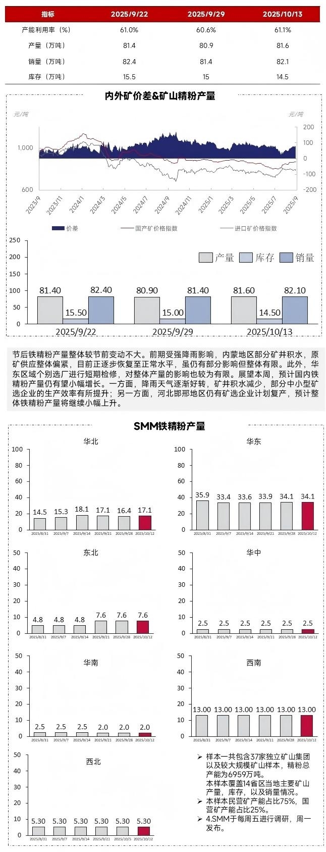 报告品种:铁矿石 原文链接:https://mp.weixin.qq.com/s/dMN3nnX0jOwmpD7F3qHxDw 根据SMM最新统计,上周国内矿山产能利用率为61.1%,环比上升0.5个百分点;铁精粉产量达到81.6万吨,较前一周增加0.7万吨。同期,矿山精粉库存下降0.5万吨至14.5万吨。 节后铁精粉产量整体较节前变动不大。前期受强降雨影响,内蒙地区部分矿井积水,原矿供应整体偏紧,目前正逐步恢复至正常水平,虽仍有部分影响但整体有限。此外,华东区域个别选厂进行短期检修,对整体产量的影响也较为有限。 展望本周,预计国内铁精粉产量仍有望小幅增长。一方面,降雨天气逐渐好转,矿井积水减少,部分中小型矿选企业的生产效率有所提升;另一方面,河北邯邢地区仍有矿选企业计划复产,预计整体铁精粉产量将继续小幅上升。 七禾带你去调研,最新调研活动请扫码咨询 更多调研报告、调研活动请扫码了解 |