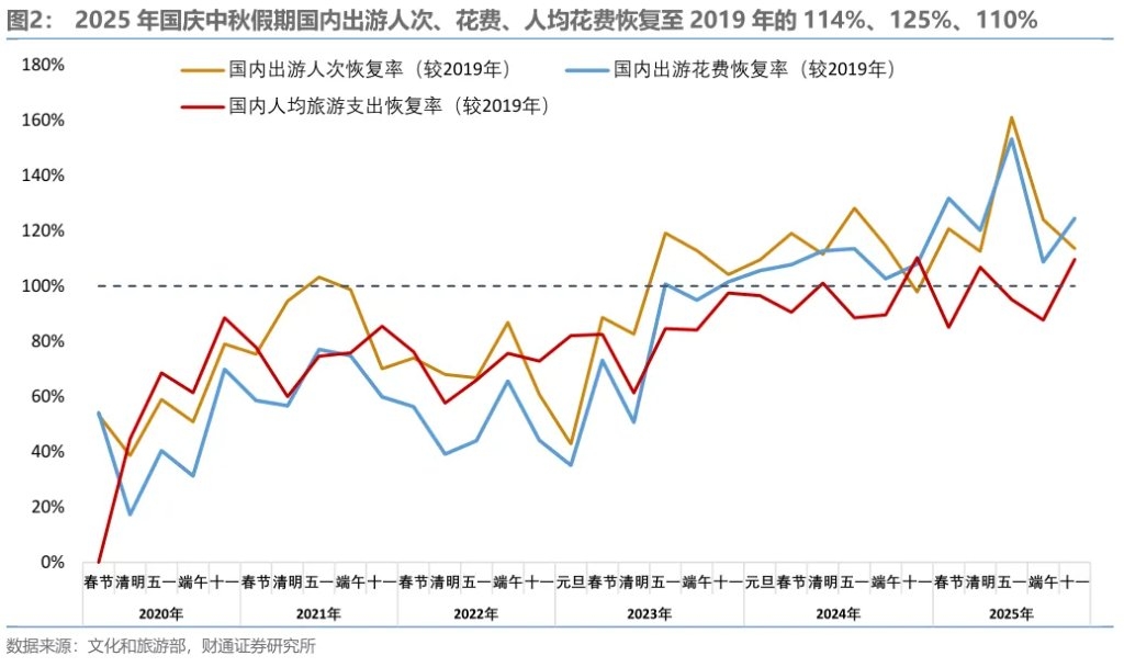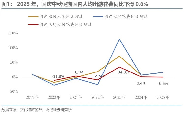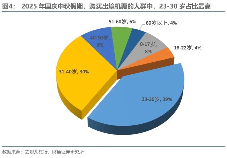 01“穷游”与“松弛”并存 今年国庆中秋双节假期的旅游数据有点“奇怪”。 国内的旅游消费似乎在变差。 文旅部数据显示,今年国庆中秋假日8天,国内出游8.88亿人次,国内出游总花费8090.06亿元,较2024年同期分别增长16.1%、15.4%,国内旅游消费总量有较为可观的增长。 但今年由于国庆和中秋假期合并,假期比去年多一天,折算成日均消费以后,国内日均出游1.11亿人次、总花费1011.26亿元,同比2024年的增长幅度分别下降至1.6%、1.0%。 而人均消费的表现更弱。2025年国庆中秋假期,国内出游人均花费911.0元,较2024年同期的916.1元下降0.6%。 也就是说,本次长假期间,国内旅游数据的改善,一靠更长的假期,二靠更多的游客,而单个居民在国内旅游上的花费反而在下降,文旅消费似乎处在“穷游”和“降级”的状态。 但传统视野之外的一些消费数据却有着超预期的表现。 和国内数据体现的“消费降级”相反,境外旅游的大幅增长似乎指向了“消费升级”。根据各大出行平台统计,今年国庆、中秋假期,出境跟团游消费订单量较去年同期增长20%以上(美团旅游,《2025年国庆、中秋假期旅游总结报告》),其中出境长线跟团游同比增长近1倍(同城旅行,《2025国庆中秋假期旅行消费报告》);出境热门目的地机票预定同比增三成(去哪儿旅行,《2025年国庆中秋假期旅游数据报告》;游客足迹覆盖超180个国家和地区,较去年大幅增长(飞猪,《2025国庆中秋假期出游快报》)。 无独有偶,以免税品为代表的国内高端消费也在复苏。今年国庆中秋假期,海口海关离岛免税金额9.44亿元,购物人数12.29万人次,人均购物金额7685元,较去年同期分别增长13.6%、3.2%、10%。 国内出游“消费降级”和出境游、免税品“消费升级”的矛盾背后,存在客观因素的影响。 一是时间。时间安排可能促进出境游复苏的原因之一。今年国庆、中秋假期不仅比去年多1天,而且请3天假可以连休12天,为耗时更长的出境旅游提供了时间基础。 二是空间。文旅部统计的是国内旅游数据,而今年国内旅游的空间有明显的结构性分化——小城市成为更多人的旅行选择。同程旅行数据显示,本次假期国内非一线城市的高品质酒店预订热度同比增长90%,高于国内整体高品质酒店的预订热度;超过30个区县目的地酒店预订热度同比增长超过100%。飞猪的报告也指出,国内三线及以下城市订单增长强劲。小城市的物价通常比大城市更低,而出境游的花费并不在文旅部数据的统计范围之内,空间上的结构分化可能也是导致本次假期国内出游人均花费下降的原因之一。 因此,仅从国内人均花费下降就断言文旅消费在走弱可能有失偏颇。 客观因素之外,本次假期旅行数据所反映的国人消费心态的变化更值得关注——国人在服务消费上正变得更有松弛感。 在经济仍有下行压力的情况下,仍然愿意花更多钱和更多时间出国旅行,本身就体现了更愿意为愉悦、为闲暇买单的松弛感,尤其是更多选择小众的旅行目的地,而非传统经典目的地。 更何况,从旅行方式上,也有充分的边际变化,“体验”正在取代“特种兵旅游”: 人们更愿意为“舒适度买单”。携程数据显示,国庆中秋假期台州神仙居、莽山五指峰、宁波灵岩等有电梯、索道助力无痛爬山的景区订单增长20%-100%+;出境包车订单同比增长120%。同程旅行数据显示,首次乘坐飞机的用户中,预订国内头等舱、商务舱的用户同比增长超过10%,首乘用户更加注重飞行的舒适度和体验度。 人们更愿意随心所欲地“说走就走”。美团旅行数据显示,58.3%的用户倾向于当天预订旅行产品。 02 一代人有一代人的消费 假期消费的结构性转变,离不开人口的代际变化。 “一代人有一代人的使命,一代人有一代人的担当”,而一代人也有一代人的消费,今年国庆中秋假期,年轻人主导了消费的边际变化。 飞猪数据显示,本次假期,1995-1999年出生的95后(26-30岁)预定人次占比最高,达到近四分之一;2005年以后出生的05后预定人次同比去年大增61%,占比提升最快;大学生机票预订量同比增长63%,其中国际机票预定同比去年增长110%。 去哪儿旅行数据显示,本次假期,13-17岁(2008-2012年出生)首次购买出境机票增幅达到63%,增幅领跑各年龄段;购买出境机票的人群中,23-30岁(1995-2002年出生)占比39%、为各年龄段最高,其次是31-40岁(1985-1994年出生)占比30%。 同程旅行数据显示,本次假期,学生群体以近四成的比例稳居国内机票第一大客群。 出生于1995-2009年的Z世代逐渐成长、步入社会,可能是引起消费结构变化的原因之一。 体验、悦己、疗愈是Z世代年轻人的消费特征。根据波士顿咨询2023年的消费者调查报告——《中国消费者的代际变迁》,Z世代相较X世代(出生于1965-1979年)、Y世代(出生于1980-1994年)具备显著的自我独立、回归享乐特点,消费过程中更看重产品/服务的基础功能;此外,Z世代拒绝内卷、期望享乐,需要充分舒缓压力,获得治愈的能量和情绪的释放。故而,旅游、潮玩、体育赛事这些兼具体验型、疗愈型的服务和商品正在成为Z世代的选择。 除了时代发展给Z世代赋予的消费特征以外,作为中国的支柱产业,房地产可能也是引起文旅消费更加松弛的原因。 谈论中国消费,不能不谈房地产。地产对消费来说是一把双刃剑,其财富效应和收入效应对消费的影响机制往往相反。 房价上涨的阶段,地产对消费的正面影响体现在两个方面: 第一,对有房