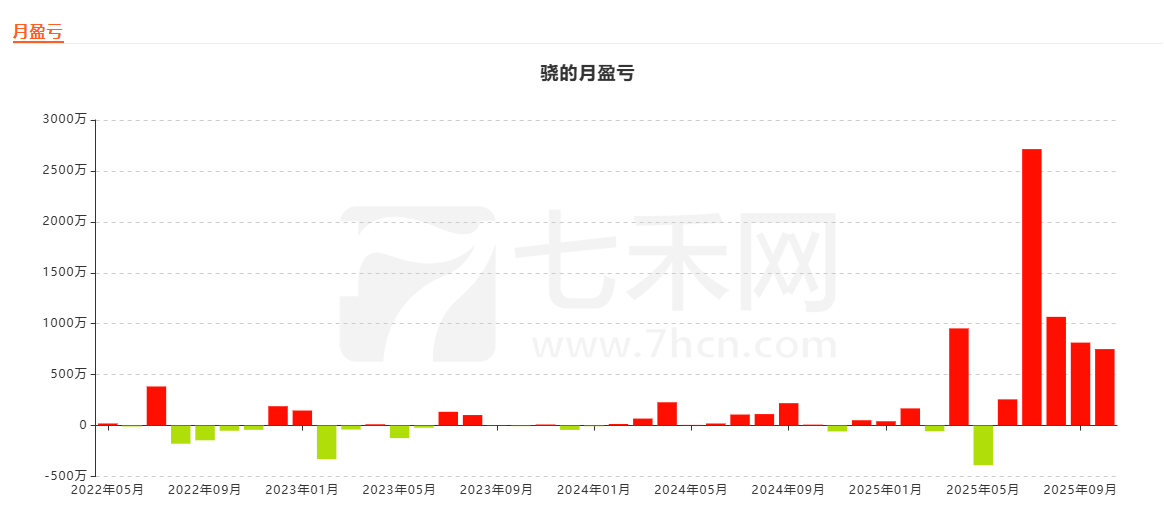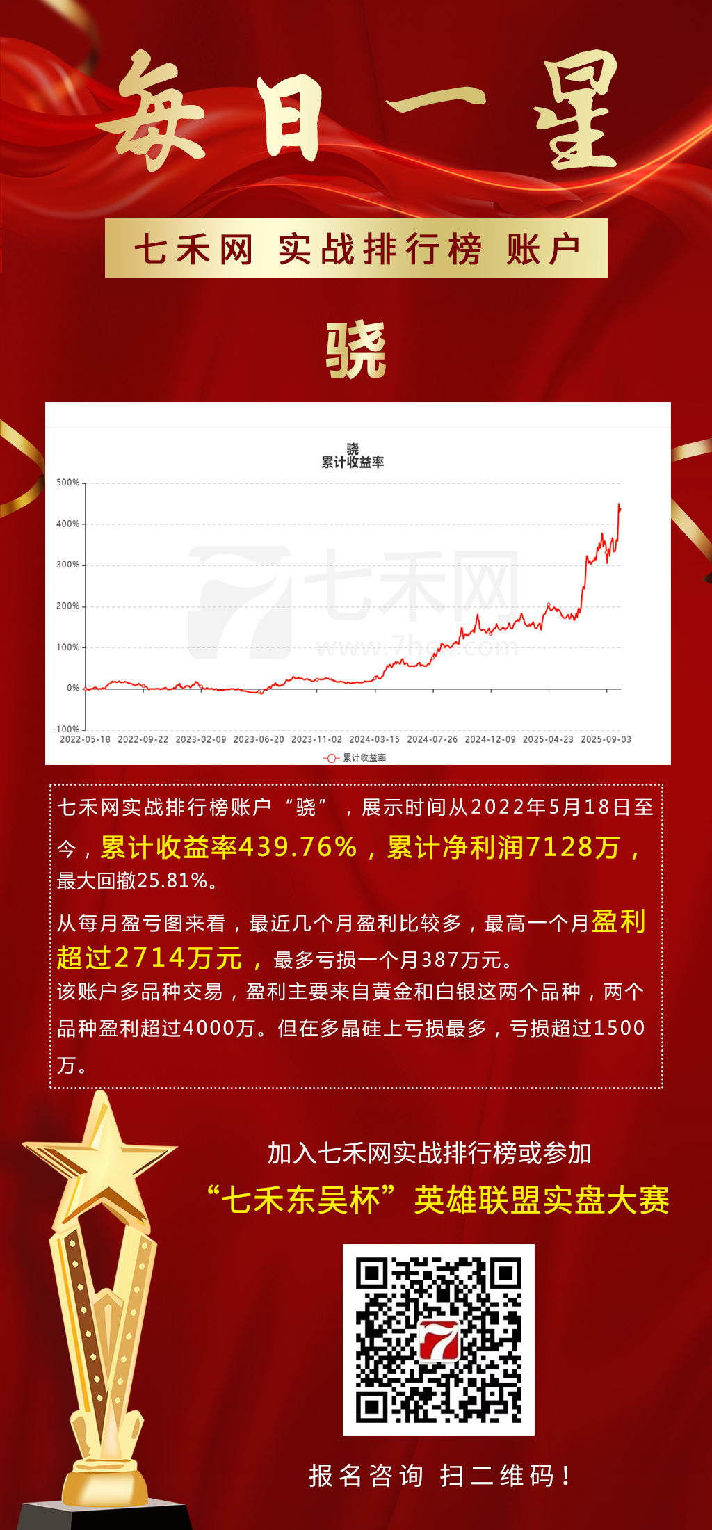 “每日一星”账户——骁 七禾网实战排行榜账户“骁”,展示时间从2022年5月18日至今,累计收益率439.76%,累计净利润7128万,最大回撤25.81%。 从每月盈亏图来看,最近几个月盈利比较多,最高一个月盈利超过2714万元,最多亏损一个月387万元。 该账户多品种交易,盈利主要来自黄金和白银这两个品种,两个品种盈利超过4000万。但在多晶硅上亏损最多,亏损超过1500万。 以上交易数据来源于七禾网实战排行榜,欲了解该账户详细数据,请登录查看: 责任编辑:翁建平 |