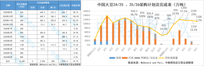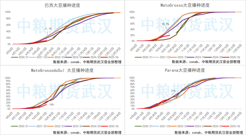 且随着国内对美船舶进行反制加上美总统威胁对国内商品加征100%的关税,中美关系再度转差,后期看中美关系大概率还是会有反复,只是如果持续不买美国大豆的话国内明年一季度供需偏紧的预期会逐步确认。存在缺口是大概率事件,但其具体程度取决于南美新豆的上市节奏和一些关键变量。中美贸易关系仍是最大的不确定性。如果政策出现转机,重新采购美豆,那么缺口预期将迅速消散。南美旧作大豆的出口能力在四季度会显著下降,南美在此期间的后继供应能力是有限的,次年3月后才能集中上市,最近巴西大豆播种顺利,2025/26年度大豆种植率为11.1%,主产区播种加快。目前预测巴西新季大豆产量可能再创纪录,达到约1.78亿吨。如果天气良好,巴西新豆能提前在3月份顺利上市并装运,缺口的持续时间将会缩短。综合来看,在不采购美国大豆的情况下,2026年第一季度,特别是2-3月份,出现供应缺口的风险相当高。不过,这个缺口更可能表现为供应紧平衡下的价格强势,而非绝对的“无豆可用”。