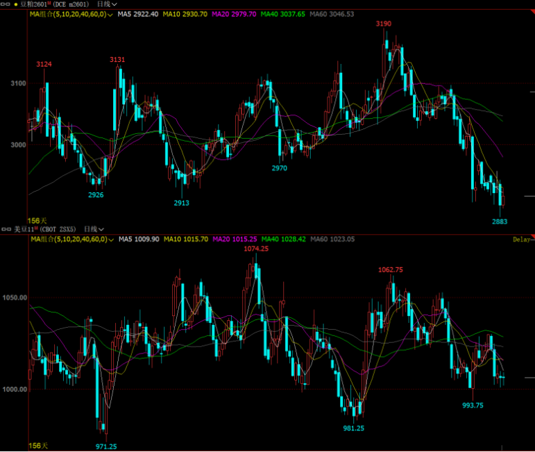 虽然近端很弱,但是也不宜过多看空,周一M2601盘面一度跌破2900,市场陷入恐慌。按巴西贴水(11月船期295左右)算,下方没有很大的下跌空间了。目前国内进口近端巴西大豆套保利润套挂较多,阿根廷大豆也处于倒挂状态,11月船期以后的大豆整体采购量还是偏少。虽然原油下跌间接影响了生柴作物豆油,间接利空美豆,但美豆在1000美分为止还是有一定支撑,对应连盘M2601的低点在2900上下,短期有一定的支撑,但缺乏明显的上行驱动,大概率还是震荡为主。盘面回落导致榨利持续偏弱,油厂对11-1月,2-4月的基差也挺价销售,较之前有少许上涨。