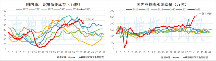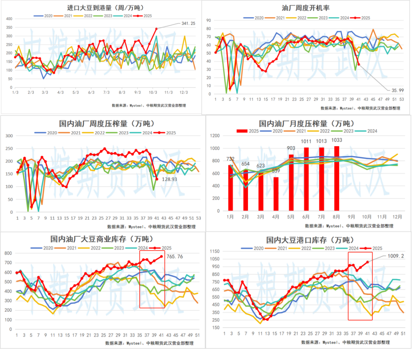 | 近端豆粕为供应端主导的宽松格局,当前市场呈现“高供应、高库存、弱需求”的特征。到港量高位运行,供应充足。截至10月13日,2025年第40-41周(9月27日-10月10日)国内全样本油厂大豆到港共计约341.25万吨大豆。从整个10月份的预估来看,市场预计大豆到港量约为949万吨,相比9月份实际超过1000万吨的到港量有所减少,但仍维持在较高水平,国内大豆供应非常充裕。而国内大豆库存也达到近几年的高位,截至2025年10月10日,全国港口大豆库存1009.2万吨,环比9月26日当周增加70.70万吨;同比去年增加213.49万吨。油厂的商业库存765.76万吨,较9月26日当周增加45.85万吨,增幅6.37%,同比去年增加95.76万吨,增幅14.29%。高到港和高库存对应的是源源不断的压榨产出,虽然节假日期间停机,压榨量有所下降,区域上,华东、华北地区因库存压力或设备问题压榨量回落,但整体开工率仍处于往年同期高位。随着节后的陆续开机,预计压榨量将会大幅上升。