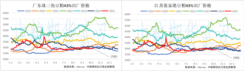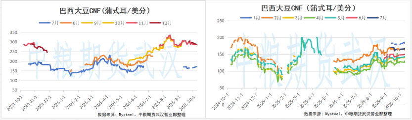 此外,豆粕库存高企也压制了价格的上行。虽然近期库存得益于供给端的短期收缩有所下降,但107万吨的绝对量相较于过去三年同期均值依然高出39万吨,同比也增加了4万吨,市场的供应基础非常充裕,价格仍面临压力。且油厂榨利恶化未传导至价格上,巴西贴水的坚挺和海运费的上涨导致的(之前就说过巴西销售进度已经过了83%,巴西农民不急着卖,且美豆关税问题导致中国主要采购南美大豆)。华东现货价格一直在2900上下震荡,成本高企并未推动价格上涨,成本定价逻辑已阶段性失效,因供应宽松是更主导因素。