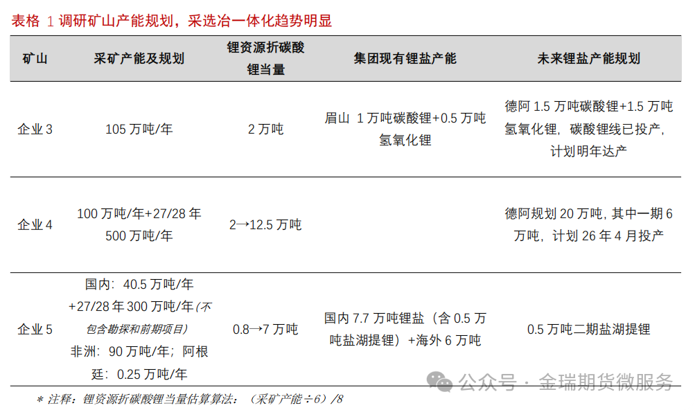 报告品种:碳酸锂 原文链接:https://mp.weixin.qq.com/s/DxVrKQm0m7Vj1CsOSRoVdQ?scene=1&click_id=16 为深入了解四川地区锂产业链最新动态,金瑞期货组织调研团于2025年9月22日至25日赴四川省阿坝藏族羌族自治州,对当地锂矿、选矿及锂盐加工共8家企业进行实地调研。 矿山端“采选冶”一体化趋势明显,下一轮产能释放高峰在2-3年后。从阿坝州三家在产矿山来看: (1)两家矿山选矿设备已于9、10月相继投产,导致外流原矿减少,外部选矿厂开工率下降; (2)矿山所属集团积极在德阿工业园布局锂盐产能,未来冶炼产能将与矿山产能基本匹配; (3)在产矿山已达产,企业4与企业5大型采选产能计划在2027–2028年投产。 锂盐端近月产能利用率高,柔性产能转产进行中,精矿供应紧张: (1)调研盐厂的碳酸锂产线普遍满产,代加工业务较多; (2)部分原氢氧化锂产线正在技改为柔性产线,后端产线增加碳化装置,技改时间仅需2-3个月,技改后根据行情调整生产; (3)川内精矿供应偏紧,进口矿需考虑精矿运费问题,外采易导致成本倒挂。 硫酸锂需求增长,主要来源两大动力: (1)外购精矿成本倒挂,采购硫酸锂加工为碳酸锂(后段工艺)具经济性; (2)磷酸二氢锂/磷酸锂作为第四代高压实磷酸铁锂产品原料的需求正在增长,硫酸锂可直接合成磷酸二氢锂/磷酸锂,省去中间碳酸锂环节。 正文 为深入了解四川地区锂产业链最新动态,金瑞期货组织调研团于2025年9月22日至25日赴四川省成都市及阿坝藏族羌族自治州,对当地共8家锂矿、选矿及锂盐加工企业进行了实地调研。 一、调研结论 矿山端“采选冶”一体化趋势明显,下一轮产能释放预计在2-3年后。从阿坝州三家在产矿山看,两家矿山选矿设备相继在9月、10月投产,整体外流原矿减少,外部选矿产能开工率下降。同时,矿山所属集团亦积极在德阿工业园建设锂盐产能,未来锂盐产能规划基本匹配矿端产能,“采-选-冶”一体化趋势明显。矿山产能规划方面,在产矿山采矿均达产,企业4和企业5的大型采矿产能规划计划于2027-2028年投产。 信息来源:财报整理,调研整理,金瑞期货研究所 锂盐端近月产能利用率高,柔性产能转产进行中,精矿供应紧张。本次调研锂盐厂的碳酸锂产线基本均处于满产,代加工业务较多。部分原氢氧化锂产线正在技改为柔性产线,后端产线增加碳化装置,技改时间仅需2-3个月,技改后实际生产可根据行情选择生产碳酸锂或氢氧化锂。川内精矿供应偏紧,进口需考虑精矿运至四川的运费问题,外采精矿生产易导致锂盐成本倒挂,中小型盐厂以代加工业务为主。 调研发现硫酸锂需求呈增长之势,一方面由于采购硫酸锂加工为碳酸锂(后段工艺)具经济性;另一方面,磷酸二氢锂/磷酸锂作为第四代高压实磷酸铁锂产品原料的需求正在增长,硫酸锂可直接合成磷酸二氢锂/磷酸锂,省去中间碳酸锂环节。 以下为市场常用的硫酸锂定价方式: ◎碳酸锂分子量:(6.941×2)+ 12.011 + (16.00×3) = 73.89 g/mol ◎其中锂总原子量:6.941 × 2 = 13.882 g/mol ◎碳酸锂中锂质量分数:(13.882 / 73.89)× 100% ≈ 18.79% 同理,无水硫酸锂中锂质量分数:(13.882 /109.947)*100% ≈12.63% 现货交易中,国内硫酸锂通常含杂质,倘若硫酸锂实际含锂量为10%,(18.79%/10%)吨硫酸锂+加工费=1吨碳酸锂,即1.879吨硫酸锂可生产1吨碳酸锂。 因此,硫酸锂价格=(碳酸锂价格-加工费)/1.879,其中加工费在1-1.2万区间。 二、企业情况 本次调研共走访四川成都和阿坝州内8 家企业,包括选矿及贸易 1 家(企业 1),矿山 3 家(企业 3、4、5),锂盐厂 4 家(企业 2、6、7、8): 企业1 经营模式:①自有选矿厂,外购川内原矿自行选矿后出售精矿,或进一步委托加工成碳酸锂出售;②外购锂精矿,委托加工成碳酸锂出售。 产能:选矿产能2000 吨/天,6 吨原矿出 1 吨 5.2-5.5%品位精矿。由于四川原矿供应紧张,选矿产能经常不满开。 产量:9 月选矿产能已满产,但下个月排产不确定。今年至今的选矿产量较去年下降,一方面由于李家沟、党坝的选矿厂陆续建成投产,外流的原矿减少;另一方面,今年无购非洲进口的原矿,去年非洲原矿矿自张家港走内河运输至重庆。今年川内选矿厂开工率估计仅 50%。 库存:少量,远期订单提前生产会产生少量库存,库存会在盘面套保。 套保:矿端留敞口,直接贸易买卖锁定;远期订单套保。 原矿定价模式:原矿定价以盘面倒算,会参考SMM 锂精矿价格,合同签订一口价,一单一议,无长协。 运输:原矿运输到选厂需2 天。阿坝州内运费贵一些,州内因运输企业垄断运费高达 6-7 毛/吨每公里,州外仅 3-4 毛/吨每公里,因此选矿厂选址需尽量靠近原矿。矿山海拔较高,山上矿石库存往往货运至都江堰。当地政府要求阿坝州内原矿税收不能出州,选矿厂需要建设在州内或德阿工业园。 选厂加工:原矿价格以盘面倒算,选矿付现成本200 元/吨出头,1.2%-1.3%原矿收率约 80%,选出5.2-5.5%品位精矿。铁杂质含量高时,除铁工序还需要增加成本。 碳酸锂代加工:四川内碳酸锂代加工通常签订长协,按年签,一单一议较少。目前代加工费用约2.1万/吨左右,价格上涨时加工费跟涨。通常情况,5.5%品味精矿代加工成碳酸锂,品位折 6%后 8 吨精矿出 1吨碳酸锂。 市场情况:①川内买原矿难:原矿供应紧缺,上下游心理价位存差异。4-5 月矿价虽低,但矿端存在捂货现象,反而价格上涨时相对好买到矿。②涉疆产品溯源严格:代加工仍可严格溯源,会追溯到生产班组对应的原料。③环保检