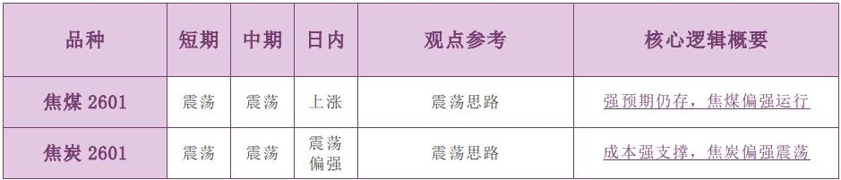 品种观点参考时间周期说明: 短期为一周以内、中期为两周至一月 备注: 1.有夜盘的品种以夜盘收盘价为起始价格,无夜盘的品种以昨日收盘价为起始价格,当日日盘收盘价为终点价格,计算涨跌幅度。 2.跌幅大于 1%为下跌,跌幅 0~1%为震荡偏弱,涨幅 0~1%为震荡偏强,涨幅大于 1%为上涨。 3.震荡偏强/偏弱只针对日内观点,短期和中期不做区分。 ◼主要品种价格行情驱动逻辑—商品期货黑色板块 品种:焦煤(JM) 日内观点:上涨 中期观点:震荡 参考观点:震荡思路 核心逻辑:截至 10 月 17 日当周,全国 523 家炼焦煤矿精煤日均产量 77.9 万吨,环比增 2.7 万吨,同比增 0.6 万吨。进口端,10 月 8 日起,甘其毛都口岸恢复通车,日通车数恢复至1100~1300 车附近。需求端,样本焦化厂和钢厂焦炭日均产量合计 111.23 万吨,周环比下降1.27 万吨。库存方面,本周下游焦化厂、钢厂积极采购,焦煤库存向下游转移,截至 10 月 17日当周,全样本独立焦化厂焦煤库存 997.37 万吨,环比增加 38.31 万吨,247 家钢厂存煤788.32 万吨,环比增加 7.19 万吨。整体来看,焦煤基本面支撑不足,但近期主产区天气和反内卷影响扰动,驱动焦煤期货主力合约维持偏强震荡运行。(仅供参考,不构成任何投资建议) 责任编辑:七禾小编 |