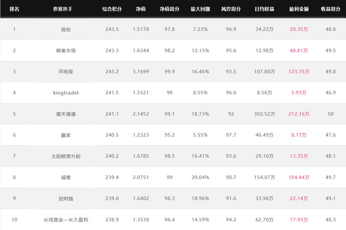 奖金上不封顶 特定期货公司参赛奖金翻倍 优秀选投 每周选优秀选手对接资金 达标必投 单笔最多给1个亿管理型资金 管理型资金盈利分成20%~70% 免费培训/研报/调研/咨询 诚邀您参赛! 为了促进国内期货市场交易人才的发展和成熟,七禾网举办本次“期货CTA英雄联盟”实盘大赛&超级服务,招募优秀的操盘手,为优秀的交易人才搭建桥梁! 第四届大赛圆满结束,第五届荣耀开启,欢迎参赛!第五届大赛已于2025年7月1日开赛,火热报名中,比赛过程中持续接受报名,大赛奖金&管理型资金&超级服务,等你来领! 2023年2月16日后,在主办方指定的几家期货公司中的某一家C公司新开户参赛,享奖金翻倍! 在主办方指定的几家期货公司中的某一家B公司新开户参赛,享奖金翻倍! 大赛中的优秀选手,只要在大赛中有3个月及以上的实盘业绩,主办方将每周发送优秀参赛者的业绩、资料给合作的数十家资方,供其考察是否投管理型资金。至2022年8月12日,资方已选出23名优秀投顾,累计投入超5.5亿元管理型资金。 优秀选投:通过主办方及资方考核后,将获得管理型资金(资金来源:七禾网自有资金(买优秀选手的基金产品)、七禾网股东、数十家合作资方) 在主办方指定的几家期货公司中的某一家B公司新开户参赛,以及2023年2月16日后,在主办方指定的几家期货公司中的某一家C公司新开户参赛,可以按照:“达标必投”进行考核(将给予单笔100万元~1亿元的管理型资金,分红比例20%~70%),详细规则请联系微信:15858201632 大赛综合排名前10名 2025.10.27