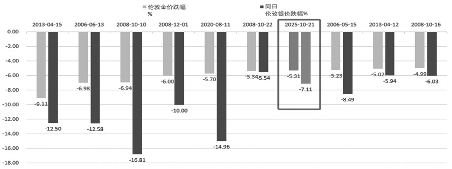 图为2000年以来金价日跌幅榜 其次,从历史角度看,本轮金价大跌处于什么水平?笔者整理了伦敦现货金价的历史数据,2025年10月21日金价跌幅5.31%,位居2000年以来金价日跌幅榜第七,而其他金价日跌幅超过本次的情况均发生在“危机时刻”,如2008年金融危机和2020年疫情期间。不过,拉长时间来看,1970年以来,本次金价单日跌幅仅排第37名。有意思的是,每次金价的大跌均伴随着银价更大幅度的下挫。 最后,历史上类似的金价单日大跌有什么样的共性?笔者汇总了2000年以来金价单日跌幅排名前十的情况,尝试总结其共性与规律。 纵观这些单日大跌的情况,可以总结出三条核心规律:第一,实际利率与货币政策是黄金最核心的“定价锚”,几乎所有的大跌均与利率预期突变或流动性环境骤变相关;第二,在真正的系统性风险中往往“泥沙俱下”,黄金的避险属性可能短期失效,呈现“现金为王”的特征;第三,当价格处于历史高位时,任何“风吹草动”都可能触发技术性抛售。 1970年至今,黄金共经历了三轮大牛市,分别是1970—1980年、2001—2012年、2016年至今。2022年11月以来,金价加速上扬。彼时,正值全球对美国经济衰退担忧升温,伴随着AI科技革命的爆发,黄金价格与美国科技股共涨。2025年以来,金价加速上行。1—4月,特朗普上任后,美债风险与美元信用下滑推升金价; 5—8月,伴随着投资者风险偏好和市场情绪的修复,市场避险需求弱化叠加降息预期强化,金价自高位回落后维持区间震荡。 梳理下来,推升本轮金价上行的因素在于四个方面:美元信用弱化、降息预期强化、疤痕效应下的配置需求和赚钱效应后的投资需求。9月之后,金价加速拉涨,突破4000元/盎司之后屡创新高,并带动白银和铂钯等贵金属价格齐涨,赚钱效应背后的投资需求成为关键推手。 那么,当前支撑金价的宏观驱动因素发生变化了吗? 美元信用弱化是奠定金价上行的长期基础。美债规模持续扩张,美联储独立性遭受挑战等均在不断透支着美元的信用。 降息预期的强化是未来一段时间影响金价的重要因素。9月美联储重启降息,美国基准利率将逐步下行。 疤痕效应下的配置需求是维持金价走势的重要支撑。2020年以来,地缘冲突反复上演,无论是各国央行,抑或是个人投资者,对安全资产的偏爱令黄金大放异彩。根据世界黄金协会的统计,2025年8月,全球官方黄金储备净增19吨,中国人民银行连续10个月增持黄金,总持仓已稳步突破2300吨。哈萨克斯坦国家银行连续第六个月购金,总持仓现达316吨。波兰国家银行更是将外汇储备中的黄金占比从20%上调至30%,累计净购金67吨,黄金总持仓达515吨,占外汇储备的22%,成为2025年全球最大黄金净买家。由此可以看出,央行增配黄金的刚性需求依旧强劲。 赚钱效应后的投资需求既是9月以来黄金“抛物线式”上涨的主要推手,也是金价短期大幅回调的原因所在。此外,黄金的“指数化投资”与各种程序化、高杠杆交易增多,加剧了价格的波动。