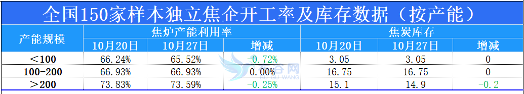 独立焦企开工率及库存详述 1、按产能统计 各产能企业开工率下降为主