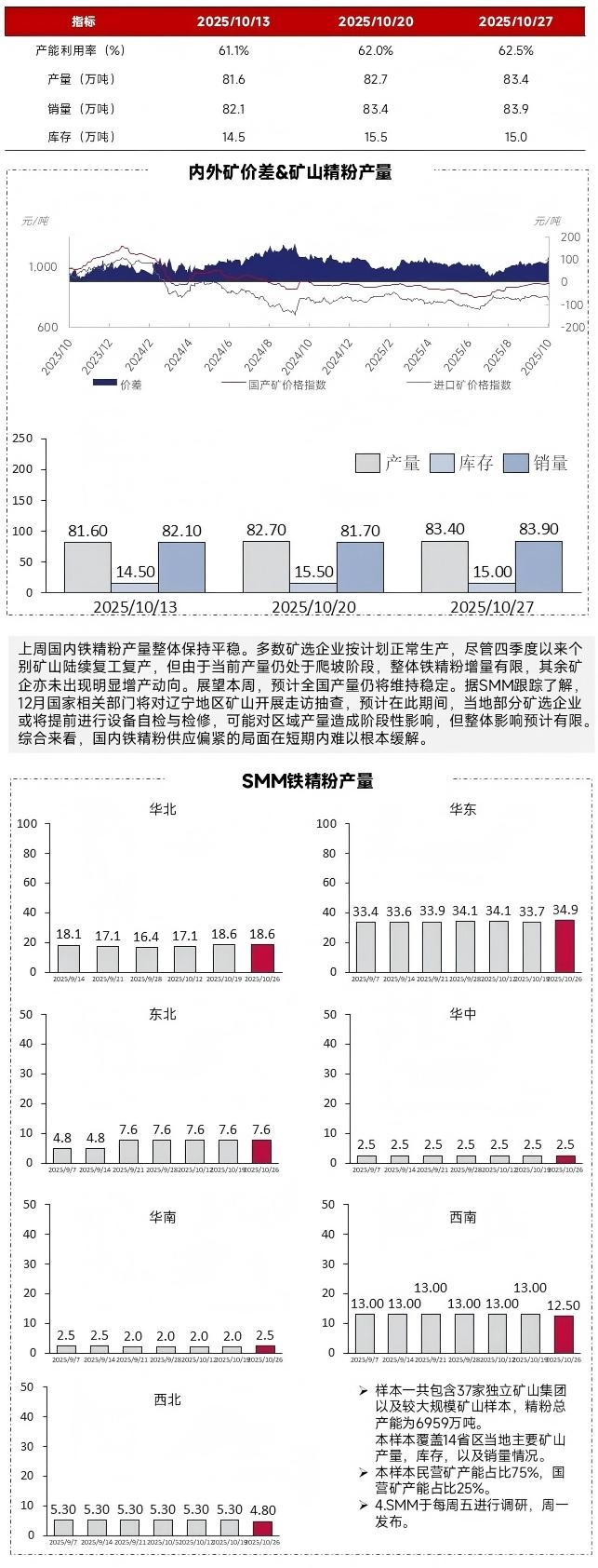| 报告品种:铁矿石 原文链接:https://mp.weixin.qq.com/s/rmMwXMwepaPh2ghLQI6izQ 根据SMM最新统计,上周国内矿山产能利用率录得62.5%,环比上升0.5个百分点;铁精粉产量为83.4万吨,较前一周增加0.7万吨。同期,矿山精粉库存小幅下降0.5万吨至15万吨。 上周国内铁精粉产量整体保持平稳。多数矿选企业按计划正常生产,尽管四季度以来个别矿山陆续复工复产,但由于当前产量仍处于爬坡阶段,整体铁精粉增量有限,其余矿企亦未出现明显增产动向。展望本周,预计全国产量仍将维持稳定。据SMM跟踪了解,12月国家相关部门将对辽宁地区矿山开展走访抽查,预计在此期间,当地部分矿选企业或将提前进行设备自检与检修,可能对区域产量造成阶段性影响,但整体影响预计有限。 综合来看,国内铁精粉供应偏紧的局面在短期内难以根本缓解。