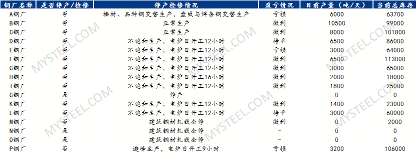 调研结果: 1、近期钢厂生产及盈亏情况 16家钢厂中,4家钢厂建筑钢材处于停产状态,占比25%;2家钢厂正常生产,占比12%;1家钢厂转产其他品种,占比7%;9家钢厂避峰生产,占比56%。除停产钢厂外,8家钢厂均处于微利状态,占比67%;2家钢厂均处于盈亏持平,占比18%;3家钢厂处于亏损状态,占比25。 2、产量及厂库情况 本周川渝钢厂建筑钢材日均产量5.49万吨,较上周减少0.6万吨,降幅9.85%;厂库80.07万吨,较上周增加5.62万吨,增幅7.5%,较上月同期增加13.06万吨,增幅16.3%。10月下游较去年施工强度减弱、施工天数减少,需求同比下降,而钢厂检修建材情况较去年减少,故厂库居高不下。 3、社库情况 截至目前川渝社库总计56.36万吨,较上周减少2.43万吨,降幅4.3%,较上月同期增加2.69万吨,增幅5%。近期省外资源到货较少,本地钢厂库存前移市场有所减缓,加之经销商出货为主,补库谨慎,社库小幅下降;随着北方天气转冷,需求减弱,后期”北材”资源或陆续到货,社库或逐步增加。 4、后期生产计划 高炉厂中除一钢厂品种交替生产外,其余钢厂预计维持正常生产;电炉厂,生产时间多维持在12小时左右,但进入11月后,枯水期电费上涨,成本增加,加之废钢资源紧张,产量或难有提升空间。 综合来看,近期需求有所减弱,而钢厂产量变化不明显,此外期现资源集中兑现,资源挤兑下,川渝建筑钢材价格弱势震荡运行。当前钢厂生产利润情况较差,加之厂库居高不下,钢厂控产、减产或对价格形成支撑。 七禾带你去调研,最新调研活动请扫码咨询