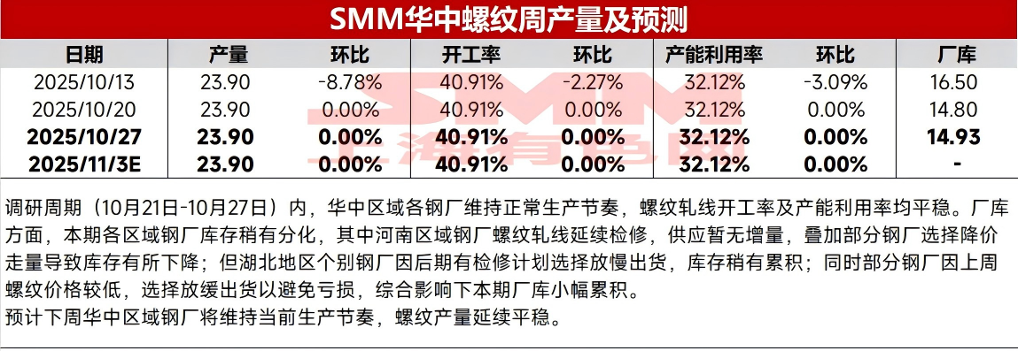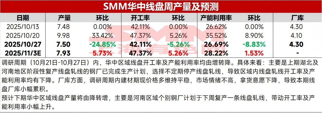 | 报告品种:螺纹钢 原文链接:https://mp.weixin.qq.com/s/fBBQISz2Zck58Am7mQdpCw 调研周期(10月21日-10月27日)内,华中区域钢厂螺纹轧线的开工率及产能利用率均平稳;线盘轧线开工率及产能利用率由增转降。