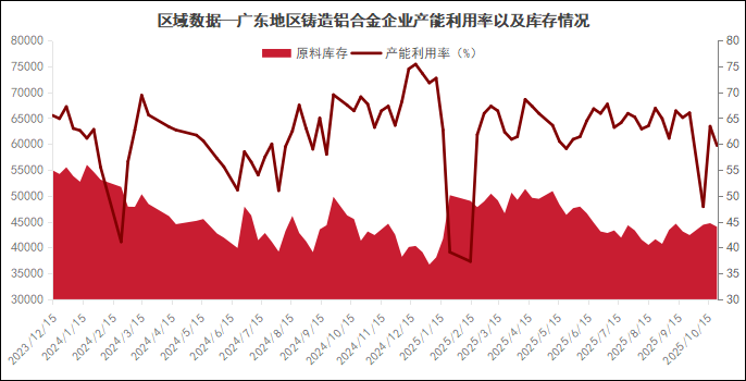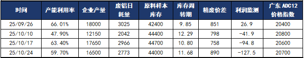 截止2025年10月24日,当周广东铸造铝合金企业产能利用率为59.70%,环比上周下调3.7个百分点;广东样本企业铸造铝合金总产量为16500吨,环比下降1150吨;企业废铝原料库存平均周转期为11.68天,环比上涨0.9天;样本企业原料库存总量为44000吨,环比上周下降700吨;周内广东铸造铝合金企业废铝日耗量为2773吨/天,环比下降193吨/天;据富宝监测,周内广东区域铸造铝合金锭生产理论利润空间位-127.5元/吨,较上周利润情况继续收缩32.7元/吨。 当周广东地区铸造铝合金企业平均产能利用率再度跌破60%,根据富宝资讯调研,主要原因有以下两点: 1、首先区别于华东部分省份的减产情况(多因税返政策再次出现问题),广东区域内企业小幅减产的核心要素在于企业生产利润的收缩,尤其是对大厂而言,铝屑料补充不足,而生铝价格完全超出成本线的情况下,满产意义不大,基本能保供下游订单即可,因此不难发现市场可流通非标及交割品铝合金锭货源明显下滑; 2、产品差异化特点鲜明,近期国内再生系铝合金如传统国标ADC12在交易活跃度以及需求上明显低于原铝系A380等型号,部分以国标为主的生产企业订单降幅明显,导致市场差异化扩大,平均开工下滑。 原材料方面,结合贸易商以及企业综合反馈,当周废铝从源头市场上到货下浮有限,而铝企实际到货则有较大出入,国产料主要库存仍堆积在贸易商手中,不过近期贸易商高位抛货也面临铝企拒收的困境,短期在铝企开工有限的情况下,预计当地废料资源或相对趋于宽松,市场隐性库存仍较大,建议关注11月下游订单集中增长后铝企备货力度的波动。 七禾带你去调研,最新调研活动请扫码咨询