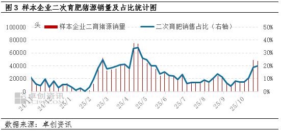 前期北方地区养殖企业生猪出栏体重维持在120公斤左右,10月份伴随着屠宰企业对大体重生猪需求的增多,养殖企业出栏体重逐步向125公斤接近。生猪出栏均重提升,可出栏适重猪源减少,导致屠宰企业收购难度增加,同时大猪供应偏紧且需求增加,共同支撑10月下旬猪价反弹。 二次育肥补栏增加导致生猪实际供应不及预期 据卓创资讯监测数据显示,全国样本企业二次育肥猪源周度销量由9月12日当周的7908头增至10月17日当周的48939头,累计增幅518.85%。10月中旬全国生猪均价跌至11元/公斤以内,同时大体重生猪需求提升,带动下游补栏二次育肥积极性提升,10月中旬开始,北方地区二次育肥养殖户补栏需求增多,上游养殖企业销售的部分生猪流入二次育肥渠道,导致市场实际生猪供应较预期减少,屠宰企业采购难度增加,从而支撑中下旬猪价上涨。