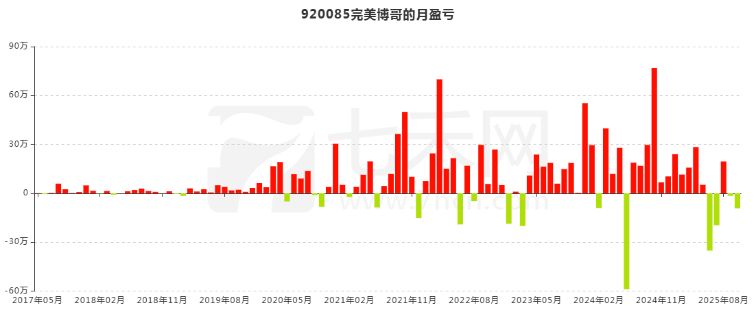 从每月盈亏表现看,账户累计交易102个月,其中80个月实现盈利,22个月出现亏损,单月最高盈利约77万。