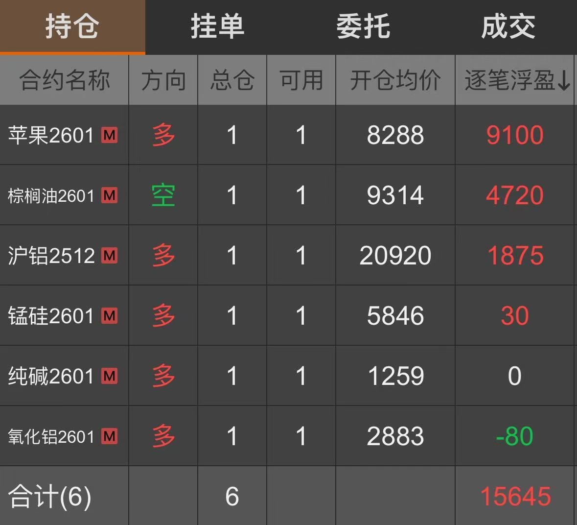 | 一、开仓总结 苹果:2025年9月22日,达到启动点的开仓条件,所以在14:54开多一手苹果2601合约,开仓价为8288。 沪铝:2025年10月13日,达到启动点的开仓条件,所以在14:32开多一手沪铝2511合约,开仓价为20885。沪铝2511合约于2025年10月17日14:45移仓至主力合约2512,开仓价为20885。 棕榈油:2025年10月17日,达到启动点的开仓条件,所以在14:45开空一手棕榈油2601合约,开仓价为9304。 纯碱:2025年10月29日,达到启动点的开仓条件,所以在14:55开多一手纯碱2601合约,开仓价为1259。