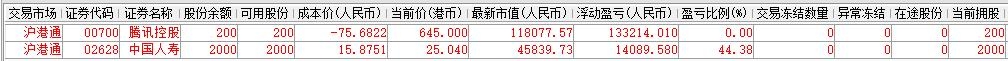 | 账户初始资金:100000.00元 2015年5月18日入金:32000.00元 2015年5月29日入金:9000.00元 2015年6月23日入金:20000.00元 2015年6月26日入金:10000.00元 2015年6月29日入金:20000.00元 2015年7月3日入金:20000.00元 2015年7月8日入金:10000.00元 2016年1月12日入金:90000.00元 2016年1月22日入金:100000.00元 2016年1月27日入金:100000.00元 2016年3月21日出金:270000.00元 2016年4月12日出金:35639.23元 2016年0月10日出金:56913.08元 2016年10月28日入金:60000.00元 2017年3月7日出金:113800.00元 参考市值:179681.30元 账户资产:179926.90元 截至今日账户A股盈亏:-46637.61元 截至今日账户港股盈亏:142236.17元 账户净值:2.014 资金股份
