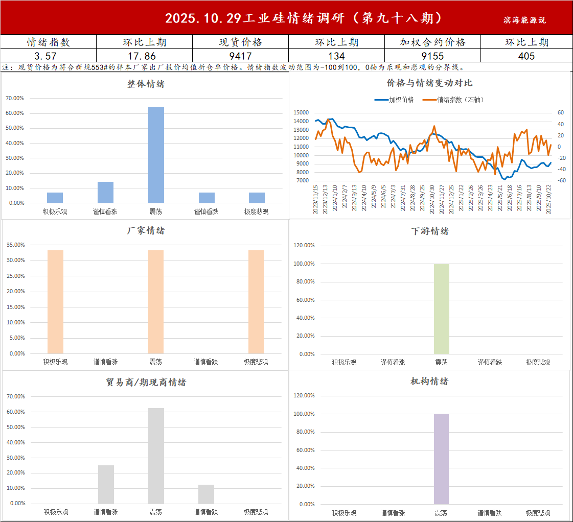 | 报告品种:工业硅 原文链接:https://mp.weixin.qq.com/s/5-8DiqxjWc9Y3B8mCyuYRw 根据样本统计,本期情绪指数为3.57,较上期回升17.86,再次运行至0轴以上,样本参与者多数持震荡略偏强的观点,近期期现价格震荡运行,重心较上期有所上移,随着临近11月,后续枯水期西南将减产,供需差会有所收窄,不过产业上来看整体矛盾不突出。