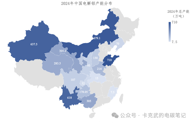 | 报告品种:铝 原文链接:https://mp.weixin.qq.com/s/HynAKuwC_930AI1Jv6gGfw 作为首批纳入全国碳市场的用户侧行业之一,以及作为欧盟碳关税首批覆盖的行业之一,电解铝是我近期调研做得比较多的一个领域。 本期还是从碳的视角简单做个分享。 1、先说产能 我国是全球铝冶炼行业无可争议的第一大国,原铝产能和产量均长期位居世界首位,占比超过全球一半。根据mysteel的统计,2024年我国电解铝已建成产能约4530万吨。 我国各省的电解铝产能分布见下图,山东、内蒙、新疆和云南四省占据总产能的近6成。