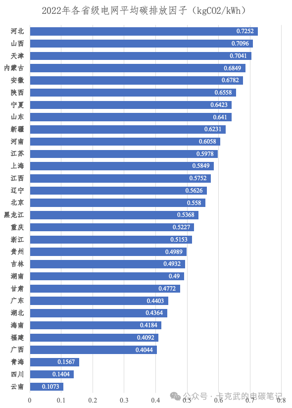 2、电解铝的碳排放 电解铝生产工艺的碳排放主要有两个方面,一是直接碳排放,二是间接碳排放。 直接碳排放来自阳极的消耗,制备电解铝的阳极通常以石油焦(炭块)为主要原料,每生产一吨电解铝,需要消耗400-500kg的阳极材料,对应碳排放1.2吨左右,且相对固定。 间接碳排放为用电碳排放,根据现阶段工艺水平,生产一吨铝约消耗13300千瓦时电量。用电的碳排放因子决定了间接碳排放的强度。按照全国平均碳排放因子(0.5366kgCO2/kWh)计算,吨铝的碳排放总量约为8.4吨(直接+间接)。 2024年12月,生态环境部公布了2022年的电力碳排放因子。除了全国平均碳排放因子外,还囊括了各省级电网平均碳排放因子,我们绘制图表如下,并进行了由高到低的排序。