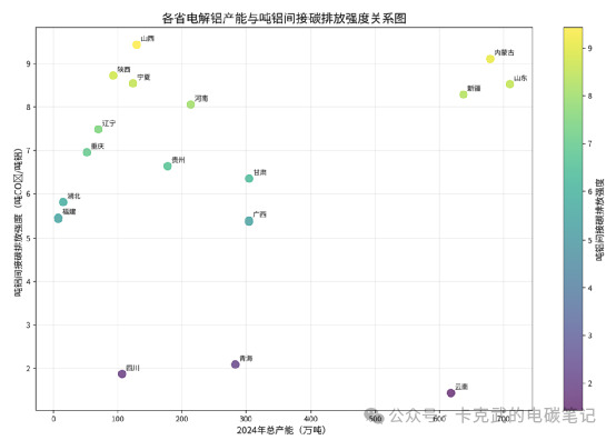 (2022年我国各省级电网平均碳排放因子) 结合各省的电解铝产能、碳排放因子,我们绘制了一张各省电解铝产能-碳排放强度的散点图。 能清晰地看到产量大、排放大的省份有三个,分别是内蒙古、山东和新疆,而云南独领风骚,因省内可再生能源占比高,使得平均用电碳排放更低。