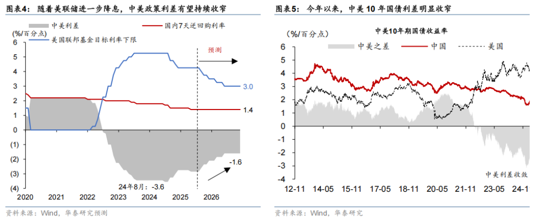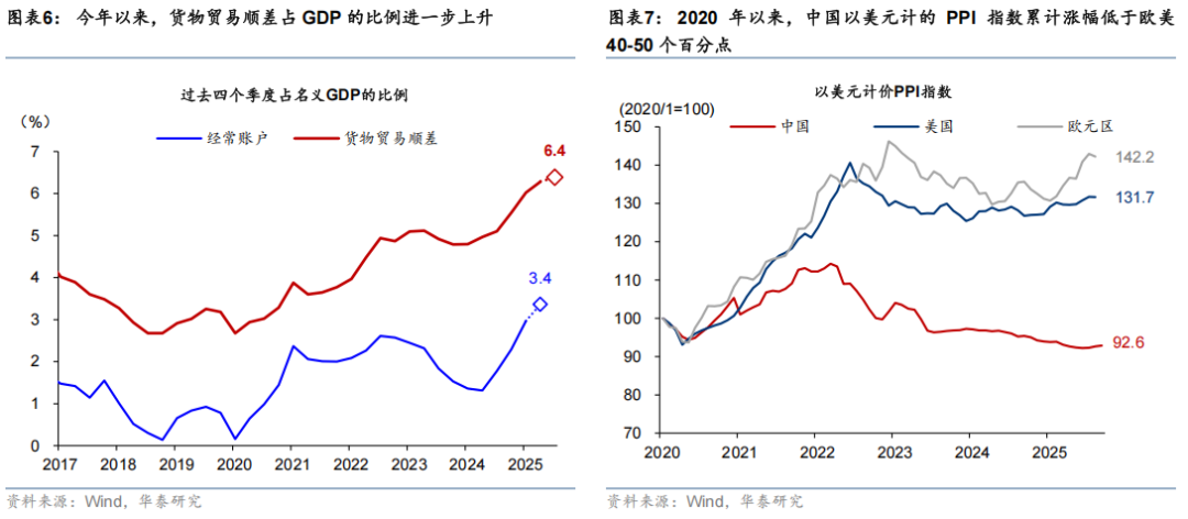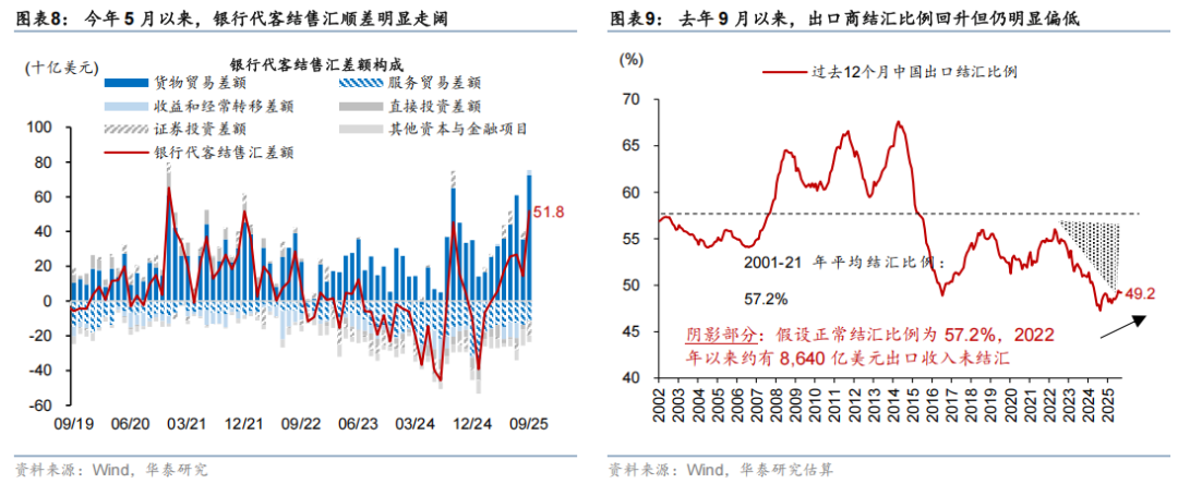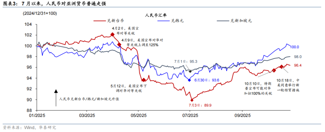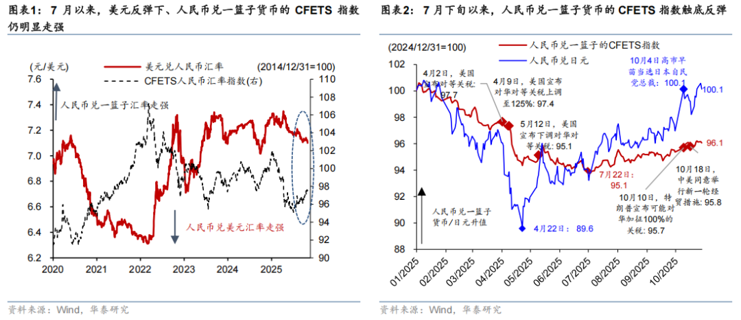 | 1. 从贬值预期消弭到升值预期蓄势而发:人民币行情开启“独立升值”的第二阶段 近期,人民币升值“独立行情”的趋势愈加明晰。年初至今,美元指数下降9%,人民币兑美元升值2.8%,兑一篮子货币回落4%。这组数据让很多人将人民币兑美元升值自然“归因”于美元走弱。但其实今年人民币汇率走势经历了几个阶段,我们认为,美元贬值可能进入更多兑亚洲货币、尤其人民币贬值的阶段——即美元有效汇率贬值超过欧元占近6成的美元指数贬值幅度(参见【华泰宏观】人民币:蓄势已久的升值,2025/8/31)。另一方面,在5月12日中美日内瓦谈判后,人民币汇率就开始“酝酿”兑一篮子、而非仅兑美元升值的“独立行情”(参见【华泰宏观】美中关税降级的缘起、影响和后续,2025/5/13)。虽然2-4月间、人民币升值幅度不及美国其他贸易伙伴,但5月12日美国宣布“延期”执行一度加至145%的对华关税后,人民币有效汇率就开始“磨底”,7月后人民币有效汇率开始走入升值通道,且9月明显加速——包括此前市场一致预期升值空间较大的亚洲其他货币、如日元、韩元、新台币等均悉数兑人民币贬值。而随着日本自民党总裁选举尘埃落定,支持宽松货币+财政政策的高市早苗接任首相,日元加速贬值,人民币兑日元及亚洲货币出现了更明显的上升趋势(图表2-3)。不知不觉之间,4月后人民币兑日元已经升值12%——而中国出口的表现仍然明显强于日本。 2. 近期一系列“催化剂”加速人民币重估 近期人民币升值有一系列的催化因素。其中一点值得注意的是,与此前几轮不同,最近中美经贸冲突从10月初的升级威胁到再谈判的经历,反而强化、而不是削弱了人民币的升值动力(参见【华泰宏观】中美经贸摩擦再升级:缘起及演绎,2025/10/12)。此外,中美利差收窄、中国出口持续超预期、人民币结汇需求上升以及日本新首相推升日元贬值预期等因素均支撑人民币走强。具体看, 贸易谈判峰回路转,市场开始对芬太尼关税调整产生预期。在10月10日特朗普宣布从11月1日起或将对中国商品加征100%的关税后不久,10月18日中美双方便同意尽快举行新一轮经贸磋商,由此本轮中美经贸关系从升级到降级的耗时较短。10月25日至26日,中美经贸团队在吉隆坡举行新一轮谈判,双方就美对华海事物流和造船业301措施、进一步延长对等关税暂停期、芬太尼关税和禁毒合作、进一步扩大贸易、出口管制等议题进行交流。会谈是“建设性”的,中美首脑在APEC原定于10月30日的会谈照常举行。而近期美国总统特朗普较为积极的表态推升了市场对芬太尼关税下调的预期。2月1日,美国宣布对中国出口商品加征10%的“芬太尼”关税,人民币兑美元应声走弱2%左右,如果美方部分下调芬太尼关税,则人民币有小幅升值的动力。值得注意的是,如果目前市场出现对华关税下调预期,结合目前对人民币汇率的预期转暖的势能,则对人民币汇率可能有较明显的推升效果。 美中利差缩小——美债曲线下移,而中国曲线陡峭化。今年以来,中美之间短端和长端利差均明显收窄。年初至今,中美政策利率利差收窄至15个基点至2.6%,且大概率进一步降至2%以内——即如果人民币出现升值趋势,利差已经不再对持有美元现金的相对收益形成有效保护。今年以来,人民银行仅下调政策利率10个基点,而目前市场预期短期中国基准利率不再下调,而美联储今年已经累计降息25个基点,且年内有望进一步降息50个基点(含10月29日议息会议)、明年或进一步降息(图表4)。两国长债利率也有所收敛——美国增长预期下调、劳工数据走弱、联储加速降息等因素推动美国10年期美债收益率从年初的4.6%左右回落至4.0%附近。而受中国增长预期上调以及股市走强等因素影响,中国10年期国债收益率从年初的1.6%附近回升至1.8%以上。由此,中美10年期国债利差从年初的-3个百分点明显收窄至-2.1个百分点左右(图表5)。 中国出口持续超预期、9月再加速,顺差强势增长,彰显人民币汇率的强大竞争力。虽然美国对中国大幅加征关税,但今年前9个月中国出口累计同比增长6.1%,在去年全年增长5.8%的基础上上进一步加速,带动贸易顺差累计同比增长26%、占GDP的比例继续上升(图表6)。一方面,出口持续超预期,显示中国制造业在供应链产业链齐全、原材料和能源价格低、电信物流等各项服务高效、以及人力成本性价比等全方位的成本和效率优势,如2020年以来,中国以美元计的PPI指数累计涨幅低于欧美40-50个百分点(图表7;参见【华泰宏观|深度】中国出口产业链的升级与重塑,2023/4/16);同时,今年人民币兑一篮子汇率走弱进一步加持了中国出口竞争力。 随着贬值预期消弥,升值预期蓄势,人民币结汇需求上升,此前流出的压力逆转,流入创2021年3月来新高。随着5月中旬中美关税降级,人民币贬值预期明显消退,银行代客结售汇顺差明显走阔,单月顺差已经达到2021年3月来最高水平,显示人民币升值预期持续升温(图表8)。而早在去年9月,随着稳增长政策发力,出口商结汇比例已开始稳步上升(图表9)。今年以来,随着国内资本市场表现稳健,证券投资项下开始录得净流入,进一步和人民币升级预期“蓄势”形成正循环。 高市早苗当选日本首相后,日元走出相对独立的贬值行情。作为“安倍路线”的继承者,高市早苗主张实行宽松的货币政策。在2024年的竞选中,高市早苗曾批评日央行的加息政策,此次竞