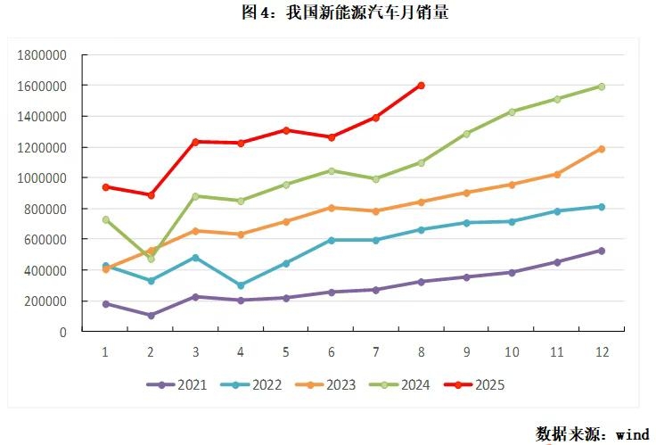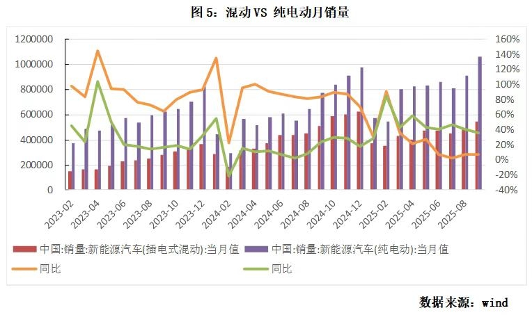 三、需求提供较强支撑 1、新能源汽车销售增速有一定放缓迹象 今年1-9月我国新能源车市场累计销量1119.6万辆,同比增长34.6%,维持较快增速。结构上,1-9月纯电动汽车和混动汽车的销量分别为721.6和397.7万辆,同比分别增长44.6%和19.6%。纯电动汽车因性价比提升销量增速较去年同期明显提升。 从近几月的数据看,销售增速环比有所下降。反映在渗透率越来越高后,增速有一定边际放缓的迹象。年底是新能源汽车车辆购置税全免的最后时间节点,消费者或会把握这一购车窗口期,因此四季度新能源车销量具备一定支撑。关注明年一季度电动车销售状况,购置税政策减半征收后,其后续销售或面临一定压力。
