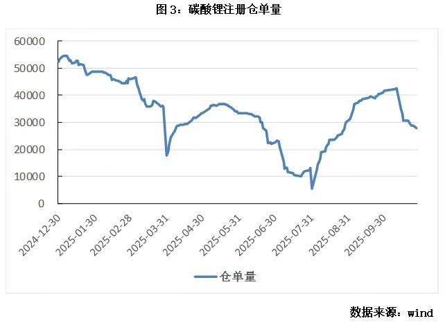进口方面,今年1-9月我国碳酸锂累计进口量17.3万吨,同比增加5.2%。其中,从智利进口11.34万吨,同比减少13%,进口占比65.5%。从阿根廷进口4.95万吨,同比增加60%,进口占比28.6%。最新数据看,9月智利出口至中国碳酸锂量为1.1万吨,环比减少14%。近几月智利的发运量不高,主要系大厂对海外碳酸锂的需求并不旺盛。 二、库存去化速度有所加快 受短期供需格局改善影响,库存去化速度有所加快。截至10月23日,国内碳酸锂社会总库存为13.04万吨,周环比减少2292吨。其中,冶炼厂、下游和其他环节的库存分别为3.37、5.53和4.14万吨,库存从冶炼端持续向下游转移。此次去库始于8月中旬,碳酸锂社会库存较高点累计减少了12052吨。在枧下窝矿复产前,预计供需维持紧平衡,库存有望持续去化。从库存结构看,冶炼厂的库存持续向下游转移,去库压力较前期明显变小。而下游因需求较好,部分企业延长了库存周期。 近期注册仓单量亦有所去化。截至10月27日,碳酸锂期货注册仓单量27739手,较前期高点累计减少14930手,下游企业接仓单较积极。
