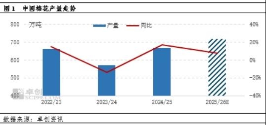 | 【导语】2025年10月份新季棉花正式集中上市,新年度棉花同比增产,且下游纺纱企业利润不佳,使棉花市场基本面依旧面临重重压力。但10月份中美双方在马来西亚再次举行经贸磋商,并取得一定进展,使业者对宏观经济向好预期提升,终端出口需求或改善,棉花价格在短期获得一定支撑。 新疆新棉实际采收产量不及预期,但同比仍增 10月新疆棉花进入集中采摘阶段,受前期吐絮不足,叠加中下旬多地阴雨天气影响,南疆部分区域新棉实际采收产量不及预期;北疆地区实际采收产量整体符合9月份预期,其中团场棉花亩产表现相对偏强,石河子、哈密等地500公斤以上占比增加5%左右。综合来看,多数棉农新棉实际采收产量仍高于去年同期,叠加新疆新年度植棉面积增加,卓创资讯统计,预计2025年中国棉花总产量719.24万吨,同比增加7.35%。