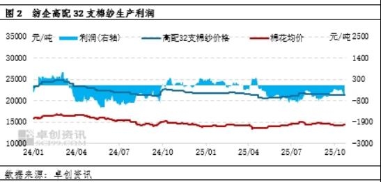 下游纱线出货不快,纺企利润不佳 10月份是棉花市场传统需求旺季,纺企开机率逐步回升,棉纱产出量稳步增加,但下游接单数量增幅有限,且纱线出货缓慢,致使部分企业棉纱出现小幅累库。由于10月份棉花原料价格上涨,纺企生产成本逐步增加,但为避免库存持续累升压力,纺纱企业大多并未上调棉纱产品价格,致使诸多纺企生产利润收缩。若按纺企即期原料成本与当期纱线价格计算,截至10月29日纺企纱线利润-1055元/吨,较月初亏损扩大346元/吨。