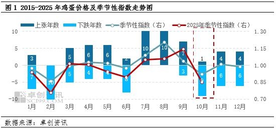 | 【导语】10月份鸡蛋价格呈现先跌后降走势,月度均价季节性下滑。主因一方面鸡蛋产能高位,供应量延续充足状态,另一方面国庆、中秋节过后,市场需求进入消费淡季,对鸡蛋价格形成利空影响,供大于求格局下,鸡蛋月度均价呈现季节性下滑走势。后市供需压力恢复性改善,预计11-12月鸡蛋价格或处过渡性修复阶段。 10月鸡蛋均价季节性下探 截至2025年10月28日,全国主产区鸡蛋月均价2.96元/斤,环比跌幅15.19%,同比跌幅34.95%。从历史价格维度来看,在10年的价格趋势中,10月份月均价下跌的年份有9年,上涨的年份有1年,2025年10月鸡蛋价格季节性指数为0.85,符合季节性下跌的特征。从月内价格变化趋势及水平来看,2025年10月鸡蛋价格呈先探低后反弹的变化趋势,受供应端利空影响,月度均价水平属近十年低位,符合鸡蛋价格周期性变化特征。