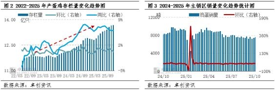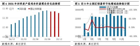 节日效应减弱,需求进入消费淡季,利空短期价格。在三季度旺季不旺背景下,业者对四季度普遍有避险情绪,而国庆、中秋节过后终端消费者前期库存尚未消化,采购鸡蛋的紧迫性不高,且基于年内鸡蛋价格水平不高,业者对行情偏弱的预期下,学校食堂、餐饮、批发市场等流通环节普遍刚需采购,并随销随采,补货及建库意向不强,食品企业开工率亦不高,整体需求跟进速度减慢,导致10月中上旬鸡蛋价格出现明显下滑过程。而下旬鸡蛋价格反弹的原因主要有三个,一方面鸡蛋价格探底达到业者补货的预期价位,刺激下游低价补货,另一方面蔬菜价格上涨,间接引起鸡蛋需求改善,除此之外气温降低,给予业者轮库时间,业者缓冲修复前期亏损的心态增加,但整体需求提升力度有限,难以支撑总需求的提升,消费淡季对蛋价延续利空影响。截至10月第4周,样本地区主销区销量23951.50吨,环比减少3.88%,同比减少10.67%。 后市鸡蛋价格具有短期承压,长期修复的预期 根据影响产蛋鸡存栏量的重要指标补栏量、出栏量、出栏日龄、上月存栏基数等,推断11-12月在产蛋鸡存栏量理论值或略增后下降,理论上12月份存栏量或下降至13.50亿只。但供应的降幅不及业者预期,或导致鸡蛋价格水平升高缺乏基础支撑因素, 2025年四季度-2026年一季度供应仍存利空影响,但利空的程度或逐步降低。