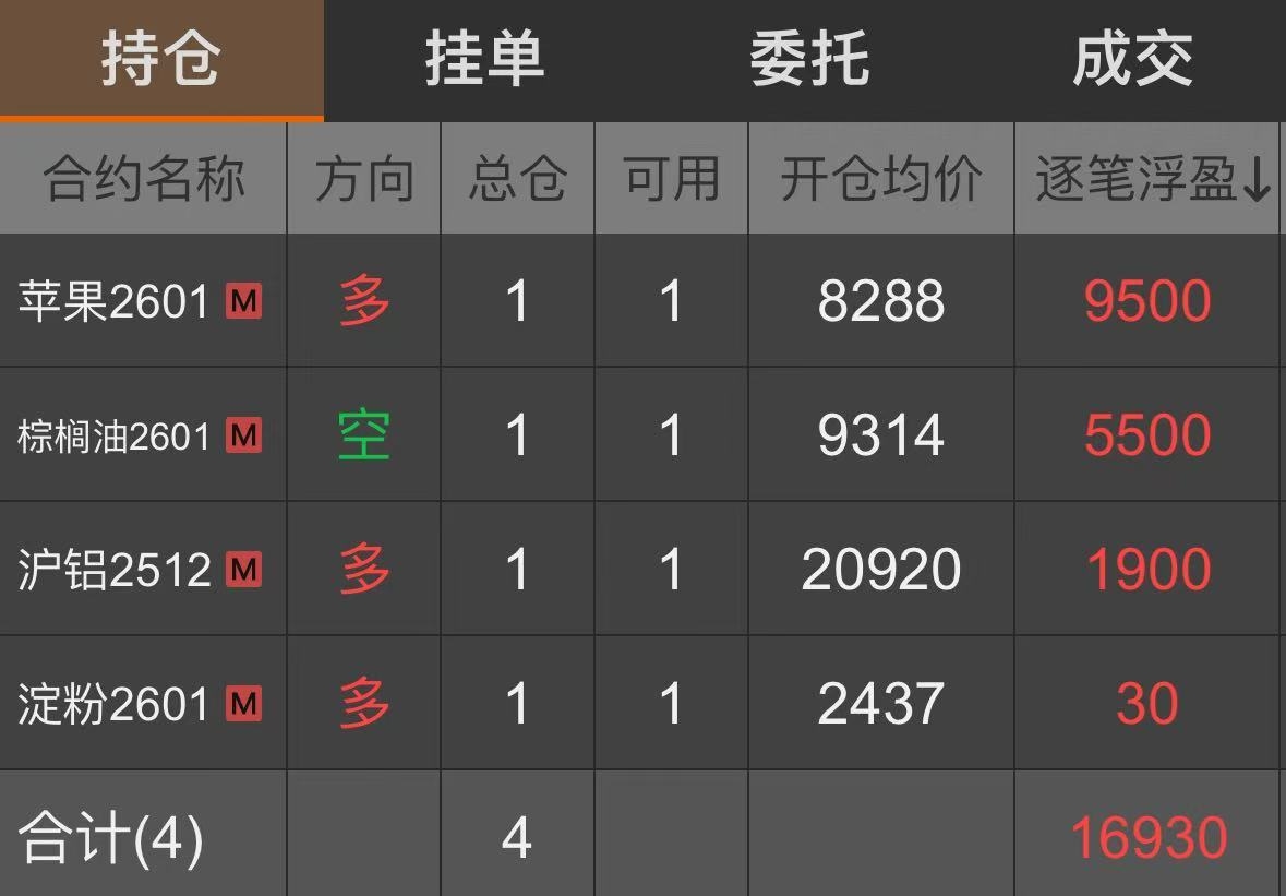 | 一、开仓总结 苹果:2025年9月22日,达到启动点的开仓条件,所以在14:54开多一手苹果2601合约,开仓价为8288。 沪铝:2025年10月13日,达到启动点的开仓条件,所以在14:32开多一手沪铝2511合约,开仓价为20885。沪铝2511合约于2025年10月17日14:45移仓至主力合约2512,开仓价为20885。 棕榈油:2025年10月17日,达到启动点的开仓条件,所以在14:45开空一手棕榈油2601合约,开仓价为9304。 纯碱:2025年10月29日,达到启动点的开仓条件,所以在14:55开多一手纯碱2601合约,开仓价为1259。 锰硅:2025年10月29日,达到启动点的开仓条件,所以在14:55开多一手锰硅2601合约,开仓价为5846。 淀粉:2025年10月31日,达到启动点的开仓条件,所以在14:49开多一手淀粉2601合约,开仓价为2437。