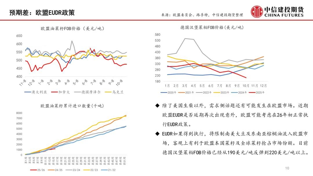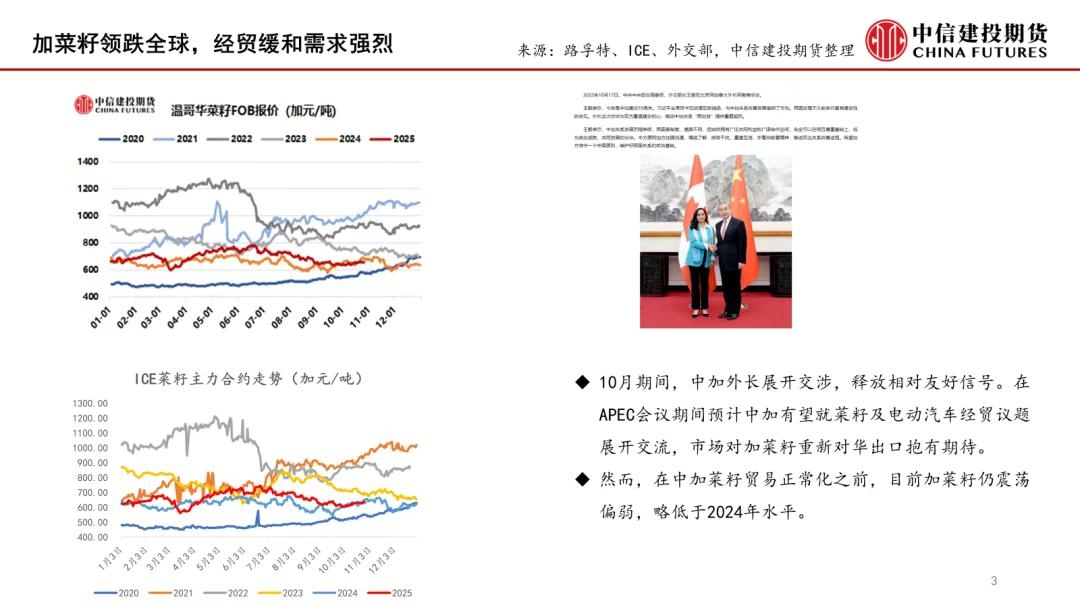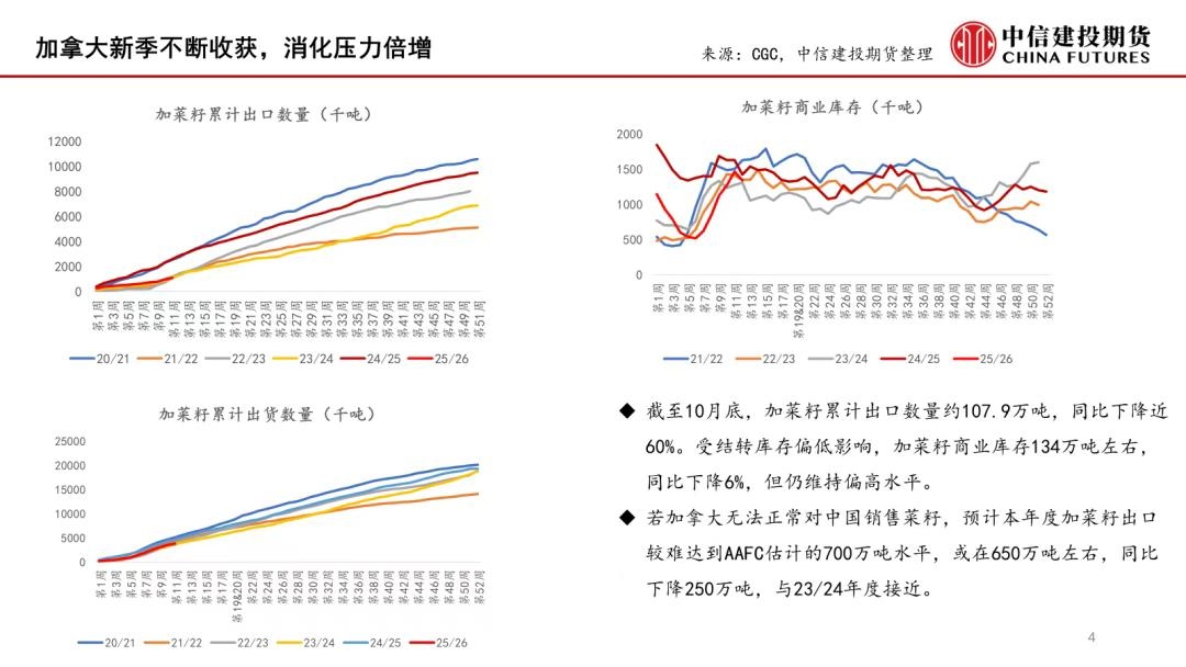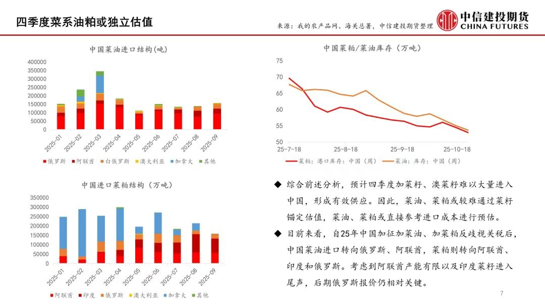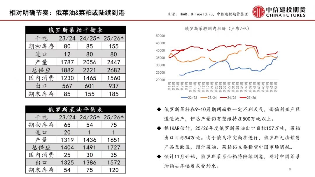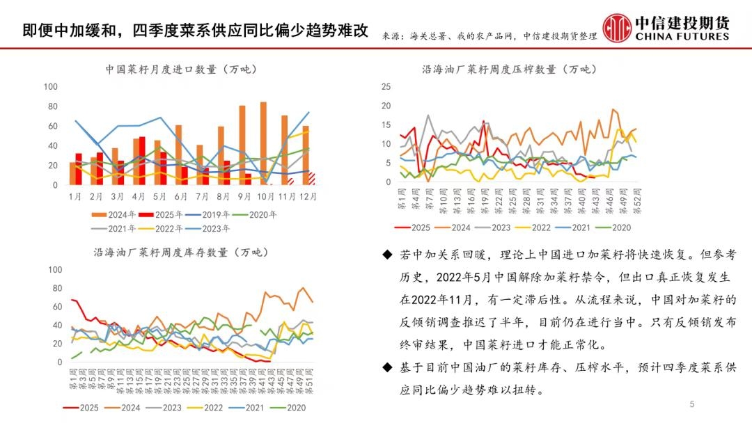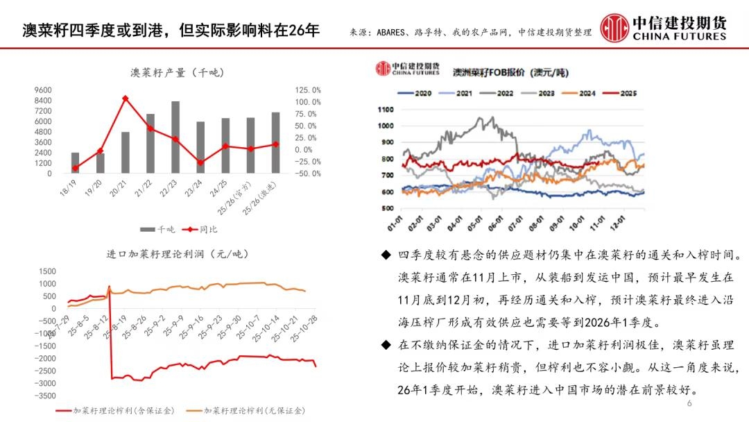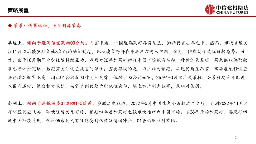 | 摘要: 单边上: 倾向于逢高沽空菜粕03合约。目前来看,中国近端菜籽库存见底,油粕仍在去库之中。然而,市场普遍关注11月以后俄罗斯菜油&菜粕的陆续到港,以及澳菜籽将在年底左右进入中国,预期上供应处于边际好转态势。另外,由于10月期间中加经贸持续互动,市场对26年加菜籽回流中国市场抱有期待。种种迹象表明,菜系供应偏紧叙事已经计价完毕,后期需关注供应恢复的弹性。需要强调的是,以上均为预期。从现实角度而言,四季度菜籽供应快速增加概率不高,因此01合约或相对具有支撑。但对于03合约而言,26年1-3月预计澳菜籽、加菜籽均有可能进入国内压榨,供应相对宽松,而需求侧仍处于积极性淡季,缺乏水产刚需叙事,或相对偏弱。 套利上: 倾向于逢低做多OI及RM1-5价差。参照历史经验,2022年5月中国恢复加菜籽进口之后,直到2022年11月才有明显供应改善,即便经贸关系好转,预期四季度加菜籽也较难快速回到中国市场。若26年开始加菜籽、澳菜籽回流中国陆续兑现,预计05合约更有可能受到估值及情绪冲击,01合约则相对有限。