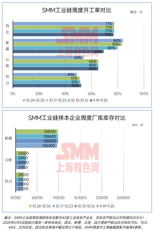 | 报告品种:工业硅 原文链接:https://mp.weixin.qq.com/s/o9zcvTRhojhsAI3mLHv3fA 根据市场反馈了解,10月24日至10月30日: 新疆地区样本硅厂周度产量在40690吨,周度开工率在84%,较上周微幅增加。本周新疆样本硅企开炉数量周环比增加2台,变化相对有限,地区开工率稳中有增加。多数硅企报价心态仍以出货为主,因工业硅期货价格走高,硅企出货价格重心也小幅上移。 西北样本硅企周度产量在11040吨,周度开工77%,周环比稳定。西北统计地区口径为青海、宁夏以及甘肃三地。样本内硅企开工率变化不大。 云南样本硅企周度产量在6265吨,周度开工率54%,较上周大幅下降。样本选取原因云南样本硅企周度开工率高于地区总开工率。云南枯水期临近,当地部分硅炉停产已经落地,使得本周开工率下降,另有部分硅企在月底停炉,云南地区开工率处于连续下行趋势。11月份云南仅剩一体化或有长单交付需求的企业在产,剩余在产炉数或不足20台。 四川样本硅企周度产量为5670吨,周度开工率在49%。样本开工率较上周延续弱势。样本选取原因样本开工率要高于地区开工率。11月四川进入平水期,然硅价低迷硅企生产压力巨大,四川多数硅企计划在10月底停炉,少量硅企计划在11月底枯水期停炉,地区开工率也大幅走低,11月四川地区预计剩余开炉数也不足20台。