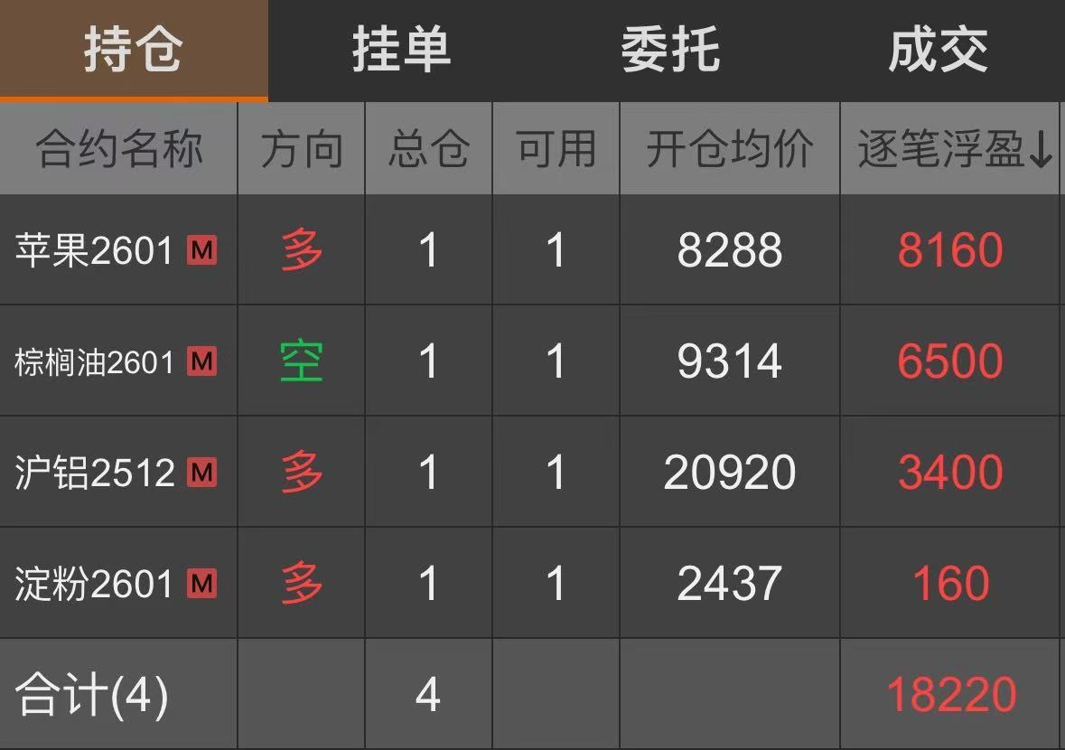 | 一、开仓总结 苹果:2025年9月22日,达到启动点的开仓条件,所以在14:54开多一手苹果2601合约,开仓价为8288。 沪铝:2025年10月13日,达到启动点的开仓条件,所以在14:32开多一手沪铝2511合约,开仓价为20885。沪铝2511合约于2025年10月17日14:45移仓至主力合约2512,开仓价为20885。 棕榈油:2025年10月17日,达到启动点的开仓条件,所以在14:45开空一手棕榈油2601合约,开仓价为9304。 淀粉:2025年10月31日,达到启动点的开仓条件,所以在14:49开多一手淀粉2601合约,开仓价为2437。 二、平仓计划 苹果:达到启动点的平仓止损/止盈条件,在收盘前或下一个交易日开盘后全部平仓。 沪铝:达到启动点的平仓止损/止盈条件,在收盘前或下一个交易日开盘后全部平仓。 棕榈油:达到启动点的平仓止损/止盈条件,在收盘前或下一个交易日开盘后全部平仓。 淀粉:达到启动点的平仓止损/止盈条件,在收盘前或下一个交易日开盘后全部平仓。 注:本交易总结由第三方提供,只作为投资理念和方法的交流,不作为七禾网的观点,也不作为投资参考和建议。 附: 1、交易者简介 十年股票/期货/外盘交易经验,每年都实现投资盈利。 擅长微观盘面分析和宏观市场分析,总结了数套有效的盈利模式,和众多高手有深入交流,收益良好。 2、持仓截图