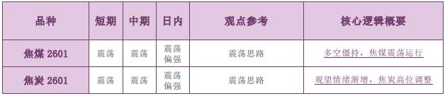 备注: 1.有夜盘的品种以夜盘收盘价为起始价格,无夜盘的品种以昨日收盘价为起始价格,当日日盘收盘价为终点价格,计算涨跌幅度。 2.跌幅大于 1%为下跌,跌幅 0~1%为震荡偏弱,涨幅 0~1%为震荡偏强,涨幅大于 1%为上涨。 3.震荡偏强/偏弱只针对日内观点,短期和中期不做区分。 ◼ 主要品种价格行情驱动逻辑—商品期货黑色板块 品种:焦煤(JM) 日内观点:震荡偏强 中期观点:震荡 参考观点:震荡思路 核心逻辑:截至 10 月 31 日当周,全国 523 家炼焦煤矿精煤日均产量 75.8 万吨,周环比小幅下降 0.3 万吨/天,基本持稳,较去年同期产量偏低 2.2 万吨/天。进口方面,10 月 20 日~25 日,288 口岸蒙煤合计通关 4814 车,周环比降 2406 车。由于中旬蒙古国政权动荡,导致通关效率短期大幅下降,至本周口岸已恢复正常,日通关车数回升至 1200 车左右。需求端,截至 10 月 31日当周,全样本独立焦化厂和钢厂焦化厂焦炭日均产量合计 110.8 万吨,周环比基本持平,小幅增加 0.08 万吨。整体来看,焦煤供需格局无明显变化,向上驱动主要来自于中美贸易关系缓和带来的宏观利好,以及安监和反内卷对焦煤供应的强预期。(仅供参考,不构成任何投资建议) 品种:焦炭(J) 日内观点:震荡偏强 中期观点:震荡 参考观点:震荡思路 核心逻辑:截至 10 月 31 日当周,全样本独立焦化厂和钢厂焦化厂焦炭日均产量合计 110.8 万吨,周环比基本持平,小幅增加 0.08 万吨。焦炭二轮涨价落地后,钢联 30 家独立焦化厂吨焦盈利-32 元/吨,周环比改善 9 元,但仍处于亏损状态,生产积极性并无显著改善,焦企提涨意愿仍存。需求端,全国 247 家钢厂铁水日均产量 236.36 万吨,周环比大幅下降 3.54 万吨/天,盈利率环比下降 2.6 个百分点,至 45.02%。整体来看,焦炭供应企稳,需求下滑,基本面边际走弱,但周内中美元首会晤,达成多项经贸共识,贸易摩擦降温带动市场氛围好转,焦炭期货暂维持高位运行。(仅供参考,不构成任何投资建议) 责任编辑:七禾小编   |