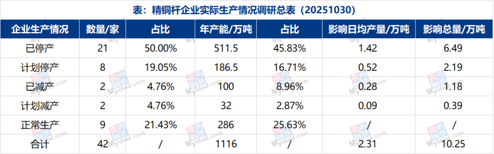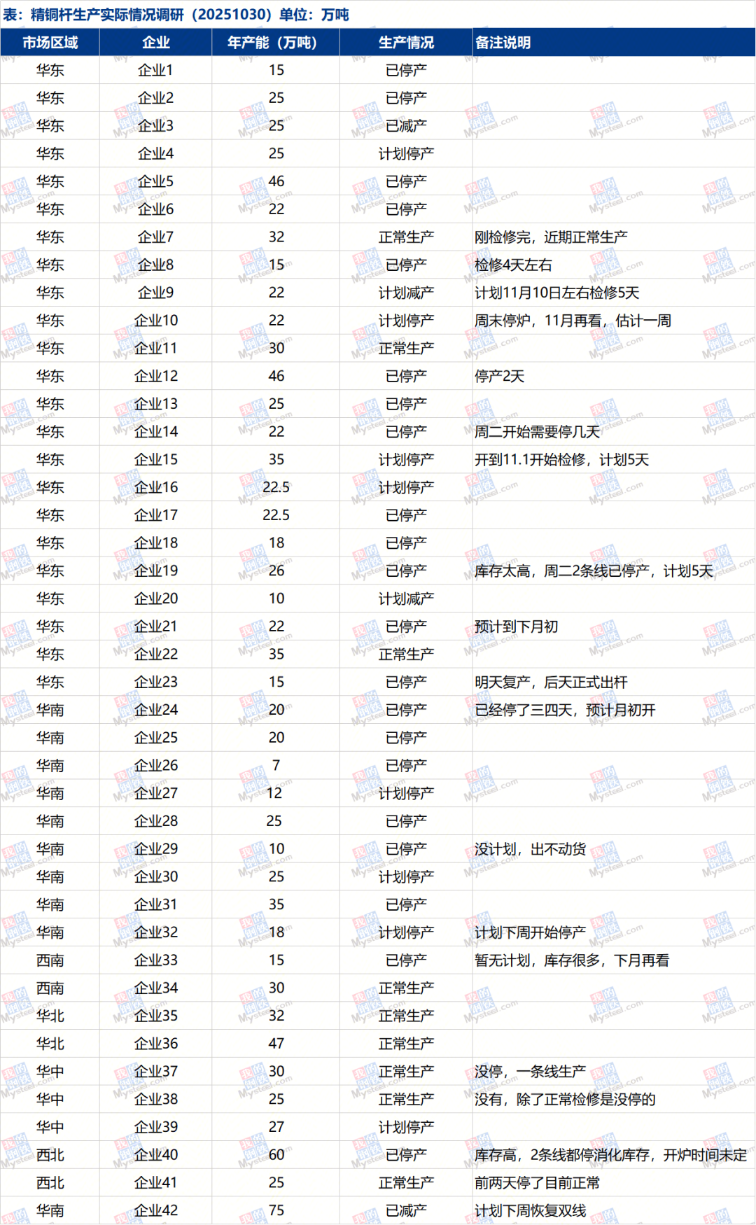 |   报告品种:铜 原文链接:https://mp.weixin.qq.com/s/go3-wFAGh-9Ku-M20eVbcA 随着铜价波动率提升且较长时间保持高位状态,近期精铜杆市场交易压力较大,各区域市场精铜杆企业生产状态出现明显变化,因此Mysteel铜杆团队就精铜杆企业实际生产情况(截至10月30日)进行了相关调研。本次调研的精铜杆企业合计42家,年产能合计1116万吨,涉及区域市场涵盖华东、华南、华北、华中、西南及西北6个市场,具体调研结果如下(文末附具体细节):