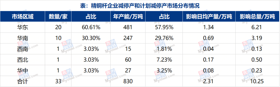 数据来源:Mysteel 从减停产企业的市场分布情况来看,目前集中的区域以华东、华南市场为主;分别来看,出现减停产和后续有减停产计划的33家精铜杆企业中,有20家来自华东市场,涉及年产能达481万吨,占比达到了58%,该区域市场中尤其以江苏、安徽省份铜杆企业影响最大,该区域可能影响的铜杆总量达6.21万吨。其次是华南市场,有10家企业合计年产能247万吨,占比约有30%,可能影响的铜杆总量达3.19万吨。这两市场因铜杆产能集中性较高,因此整体影响也较其他区域市场更为明显。此外西南、西北以及华中市场也有极个别铜杆企业陷入减停产困境,但整体影响量并不大。