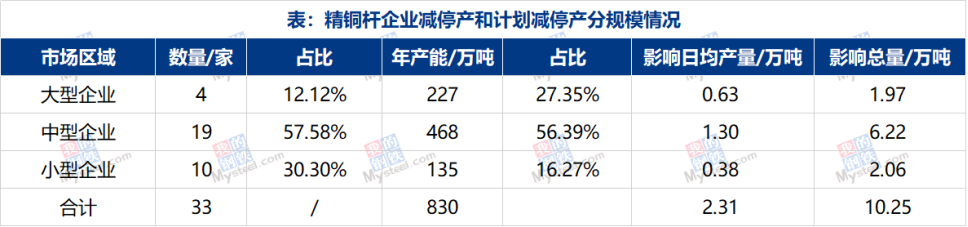 数据来源:Mysteel 从精铜杆企业不同规模来看,减停产企业主要分布在中型企业(40万吨>年产能≥20万吨),合计有19家,涉及年产能达468万吨,影响铜杆总量达6.22万吨;其次有10家小型企业(年产能<20万吨),合计年产能达135万吨,影响铜杆总量达2.06万吨;减停产的大型企业虽只有4家,但因涉及的产能较大达227万吨,影响的铜杆总量接近2.万吨。