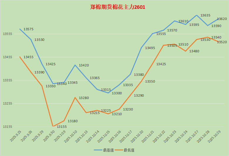 9、棉花:郑棉CF2601主力合约在13425~13635之间窄幅震荡,预计短期内仍以区间震荡为主,随着新棉大量上市,创历史纪录产量涌上市,新棉基差和盘面或将持续承压。