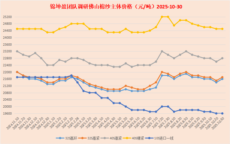 10、纺纱厂:新疆纺纱产能扩张,内地产能边际减少;大部分内地纺纱厂连续亏本经营,新疆纺纱厂利润继续变薄甚至微亏,导致纺纱热情下降,影响纺纱开机率。差异化或多品种混纺类稍好,整体纺纱厂对后市信心不足。原料随买随用,刚需采购。 11、出口:据海关总署统计报告,2025年9月份出口对比去年同期,纺织纱线织物及其制品、服装分别增加12.1%,-8.6%;1~9月累计出口对比去年同期,纺织纱线织物及其制品、服装分别增加7.0%,-1.5%。 12、国内需求:国家、地方政府出台众多利好政策,拉动内需消费,纺织板块效应显现相对有限。 13、棉纱价格:随着棉花期货震荡上行,棉纱价格上调100~200元/吨,纺纱厂价格有量可议。当前佛山市场现金含税主流报价,国产牌子货纯棉32支高配环纺21500~21600元/吨,纯棉32支高配紧密21600~21700元/吨,纯棉40支高配紧密22700~22800元/吨,纯棉40支精梳紧密24400~24500元/吨,进口一线纯棉10支赛络散货19600元/吨,整柜优惠100元/吨。