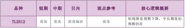 备注: 1.有夜盘的品种以夜盘收盘价为起始价格,无夜盘的品种以昨日收盘价为起始价格,当日日盘收盘价为终点价格,计算涨跌幅度。 2.跌幅大于 1%为下跌,跌幅 0~1%为震荡偏弱,涨幅 0~1%为震荡偏强,涨幅大于 1%为上涨。 3.震荡偏强/偏弱只针对日内观点,短期和中期不做区分。 ◼ 主要品种价格行情驱动逻辑—金融期货股指板块 品种:TL、T、TF、TS 日内观点:震荡偏弱 中期观点:震荡 参考观点:震荡 核心逻辑:昨日国债期货均震荡整理。由于宏观方面有效需求不足的问题仍存,中长期来看需要偏宽松的货币环境稳定需求端,对国债期货构成较强支撑。不过年内完成经济增长目标的压力不大,短期内全面降息的可能性较低,国债期货上行动能有限。总的来说,短期内国债期货震荡整理为主。 责任编辑:七禾小编 |