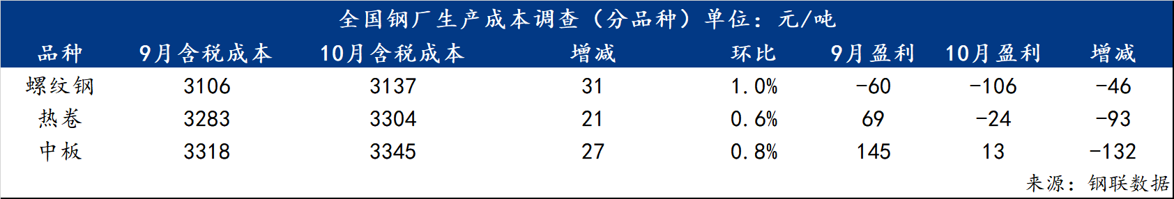 | 报告品种:螺纹钢 原文链接:https://factory.mysteel.com/a/25110515/897515BB0F04E291.html 核心观点: (1)10月底对全国主要样本高炉生产企业进行调查,其产品生产成本小幅增加,幅度在30元/吨左右。数据显示,当前螺纹钢平均含税成本为3137元/吨,环比增加31元/吨,增幅1%;热卷平均含税成本为3304元/吨,环比上涨21元/吨,增幅0.6%;中厚板平均含税成本为3345元/吨,环比上涨27元/吨,增幅0.8%。 (2)10月Mysteel(62%)铁矿石指数平均价在105美元,较上月持平;10月华北地区二级冶金焦均价为1436元/吨,较上月上涨26元/吨;10月唐山钢坯含税出厂价平均为2979元/吨,较上月下跌50元/吨。 (3)10月底对全国部分样本高炉生产企业盈利情况进行调查,螺纹钢样本平均利润-106元/吨,较上月盈利减少46元/吨,热卷样本平均盈利-24元/吨,较上月盈利减少93元/吨,中厚板样本平均盈利13元/吨,盈利较上月盈利减少132元/吨。 长流程钢厂主要品种生产成本及盈利情况 Mysteel调查的全国91家高炉钢厂,10月底螺纹钢平均含税成本为3137元/吨,环比上涨31元/吨,增幅1%,盈利-106元/吨,减少46元/吨;热卷为3304元/吨,环比增加21元/吨,增幅0.6%,盈利-24元/吨,减少93元/吨;中厚板为3345元/吨,环比增加27元/吨,增幅0.8%,盈利13元/吨,减少132元/吨。 表一:全国91家样本钢厂生产成本(分区域)调查统计(单位:元/吨)