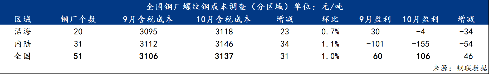 螺纹钢方面,10月底对全国51家螺纹钢生产企业调研了解到,螺纹钢平均成本为3137元/吨,环比增加31元/吨,增幅1%;分区域来看,沿海地区20家钢厂螺纹钢平均成本为3118元/吨,环比增加23元/吨,增0.7%;内陆地区31家钢厂螺纹钢平均成本为3146元/吨,环比增加34元/吨,增幅1.1%;盈利空间方面,10月份螺纹钢生产企业盈利空间在-106元/吨,环比减少46元/吨。 表二:全国51家主要样本高炉钢厂螺纹钢成本(分区域)调查统计(单位:元/吨)