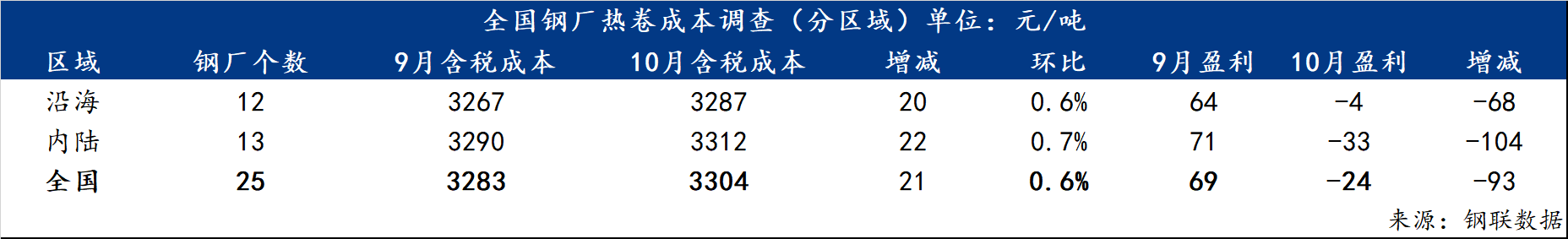 热卷方面,10月底对全国25家热轧板卷生产企业调研了解到,热卷平均成本为3304元/吨,环比增加21元/吨,增幅0.6%;分区域来看,沿海地区12家钢厂热卷平均成本为3287元/吨,环比增加20元/吨,增幅0.6%;内陆地区13家钢厂热卷平均成本为3312元/吨,环比增加22元/吨,增幅0.7%;盈利空间方面,10月份热卷生产企业盈利-24元/吨,盈利环比减少93元/吨。 表三:全国25家主要样本高炉钢厂热卷成本(分区域)调查统计(单位:元/吨)