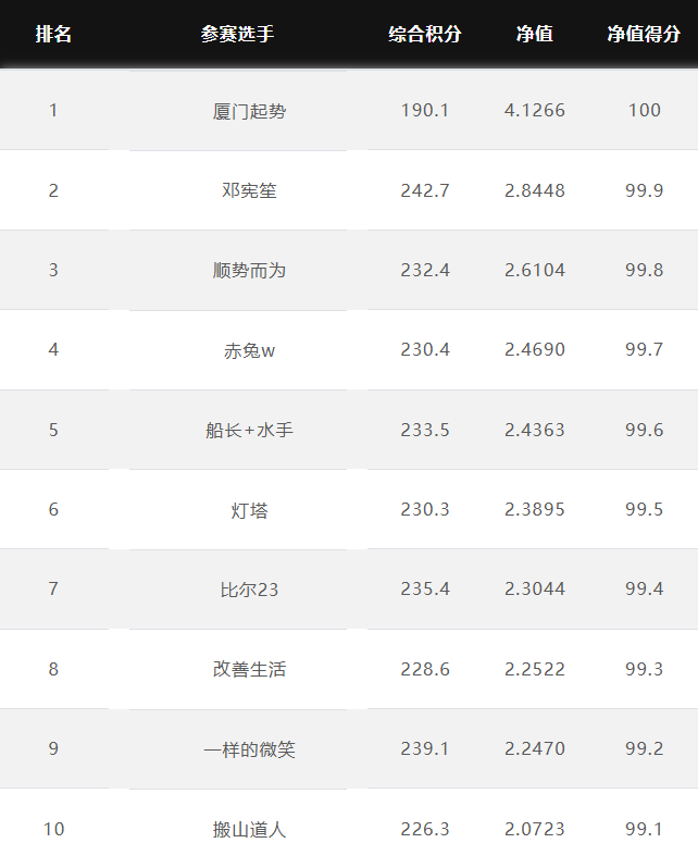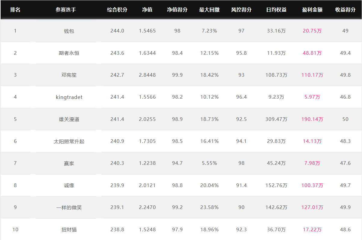奖金上不封顶 特定期货公司参赛奖金翻倍 优秀选投 每周选优秀选手对接资金 达标必投 单笔最多给1个亿管理型资金 管理型资金盈利分成20%~70% 免费培训/研报/调研/咨询 诚邀您参赛! 为了促进国内期货市场交易人才的发展和成熟,七禾网举办本次“期货CTA英雄联盟”实盘大赛&超级服务,招募优秀的操盘手,为优秀的交易人才搭建桥梁! 第四届大赛圆满结束,第五届荣耀开启,欢迎参赛!第五届大赛已于2025年7月1日开赛,火热报名中,比赛过程中持续接受报名,大赛奖金&管理型资金&超级服务,等你来领! 2023年2月16日后,在主办方指定的几家期货公司中的某一家C公司新开户参赛,享奖金翻倍! 在主办方指定的几家期货公司中的某一家B公司新开户参赛,享奖金翻倍! 大赛中的优秀选手,只要在大赛中有3个月及以上的实盘业绩,主办方将每周发送优秀参赛者的业绩、资料给合作的数十家资方,供其考察是否投管理型资金。至2022年8月12日,资方已选出23名优秀投顾,累计投入超5.5亿元管理型资金。 优秀选投:通过主办方及资方考核后,将获得管理型资金(资金来源:七禾网自有资金(买优秀选手的基金产品)、七禾网股东、数十家合作资方) 在主办方指定的几家期货公司中的某一家B公司新开户参赛,以及2023年2月16日后,在主办方指定的几家期货公司中的某一家C公司新开户参赛,可以按照:“达标必投”进行考核(将给予单笔100万元~1亿元的管理型资金,分红比例20%~70%),详细规则请联系微信:15858201632 大赛综合排名前10名 2025.11.5