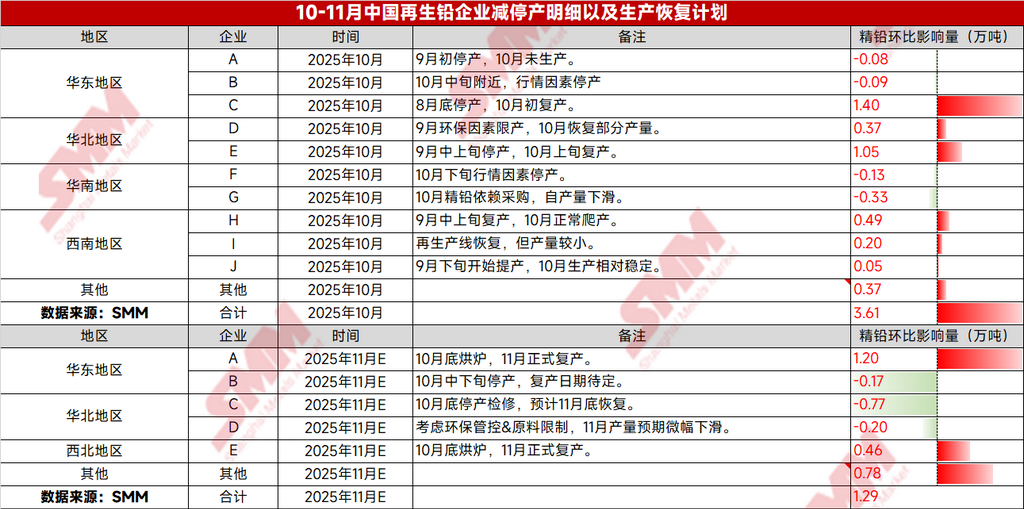 | 报告品种:铅 原文链接:https://mp.weixin.qq.com/s/cG2ImFAe654-wqcx37D5jw 一、再生铅产量动态 (1)10月多家炼厂复产,产量如期增加 10月,多家再生铅炼厂恢复生产,再生铅产量如期上升。进入11月后,仍有大型再生铅炼厂计划恢复生产,预计再生铅产量将维持增长态势。