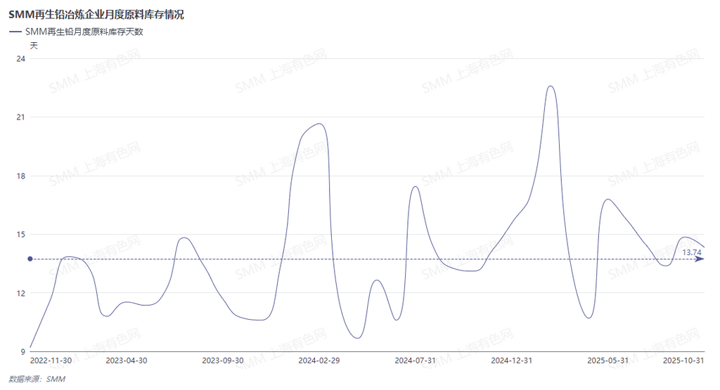 (2)市场关注焦点 目前,市场高度关注原料供应能否持续支持再生铅产量的增加。SMM基于公开信息、市场交流以及内部数据库模型,对相关情况进行分析,供市场参与者参考。 二、再生铅冶炼企业原料库存分析 (1)原料库存现状 截至10月31日,再生铅冶炼企业月度原料库存天数较历史平均值高出1-2天。然而,这一库存增加并非由于废旧铅酸蓄电池市场报废量增加所致。