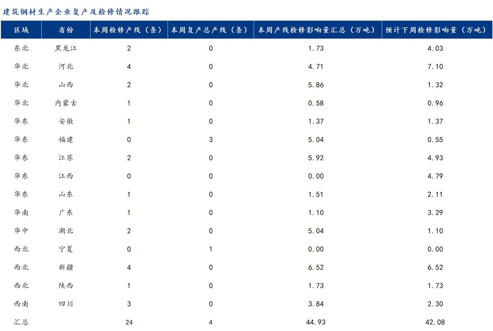 | 报告品种:螺纹钢 原文链接:https://gc.mysteel.com/a/25110913/0531FB388AD0022C.html 根据Mysteel调研,本周建筑钢材钢厂检修影响量有所扩大。具体来看,本周有15个省份的钢厂涉及产线检修、复产,其中检修产线24条、较上周增加13条,复产产线4条、较上周增加1条,按照轧机日均产量测算,产线检修影响产量44.93万吨,预计下周产线检修影响产量42.08万吨。